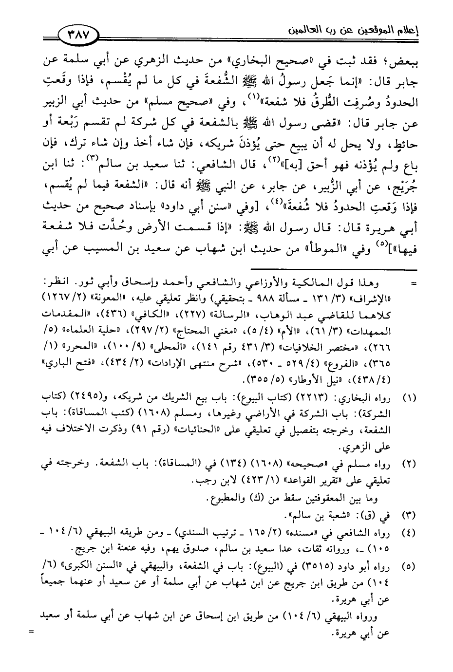 (١) رواه البخاري: (٢٢١٣) (كتاب البيوع): باب بيع الشريك من شريكه، و (٢٤٩٥) (كتاب الشركة): باب الشركة في الأراضي وغيرها، ومسلم (١٦٠٨) (كتب المساقاة): باب الشفعة، وخرجته بتفصيل في تعليقي على "الحنائيات" (رقم ٩١) وذكرت الاختلاف فيه على الزهري.