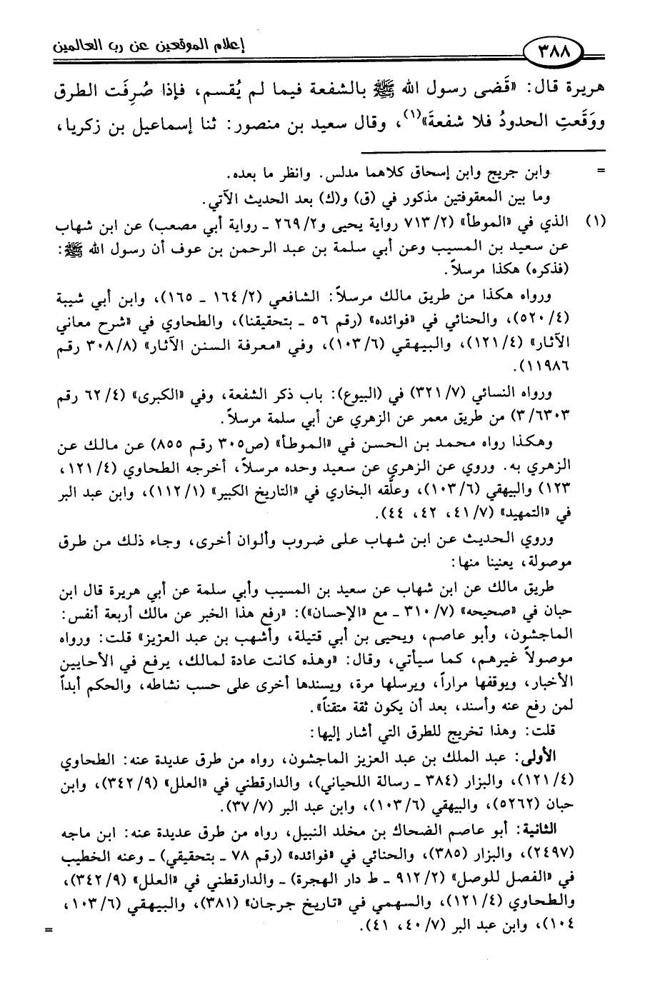 هريرة قال: "قَضى رسول اللَّه -صلى اللَّه عليه وسلم- بالشفعة فيما لم يُقسم، فإذا صُرِفَت الطرق ووَقَعتِ الحدودُ فلا شفعةَ" (١)، وقال سعيد بن منصور: ثنا إسماعيل بن زكريا،