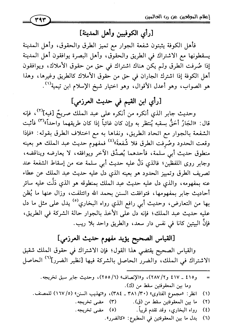 فأهل الكوفة يثبتون شفعة الجوار مع تميز الطرق والحقوق، وأهل المدينة يسقطونها مع الاشتراك في الطريق والحقوق، وأهل البصرة يوافقون أهل المدينة إذا صُرفت الطرق ولم يكن هناك اشتراك في حق من حقوق الأملاك، ويوافقون أهل الكوفة إذا اشترك الجاران في حق من حقوق الأملاك كالطريق وغيرها، وهذا هو الصواب، وهو أعدل الأقوال، وهو اختيار شيخ الإسلام ابن تيمية (١).