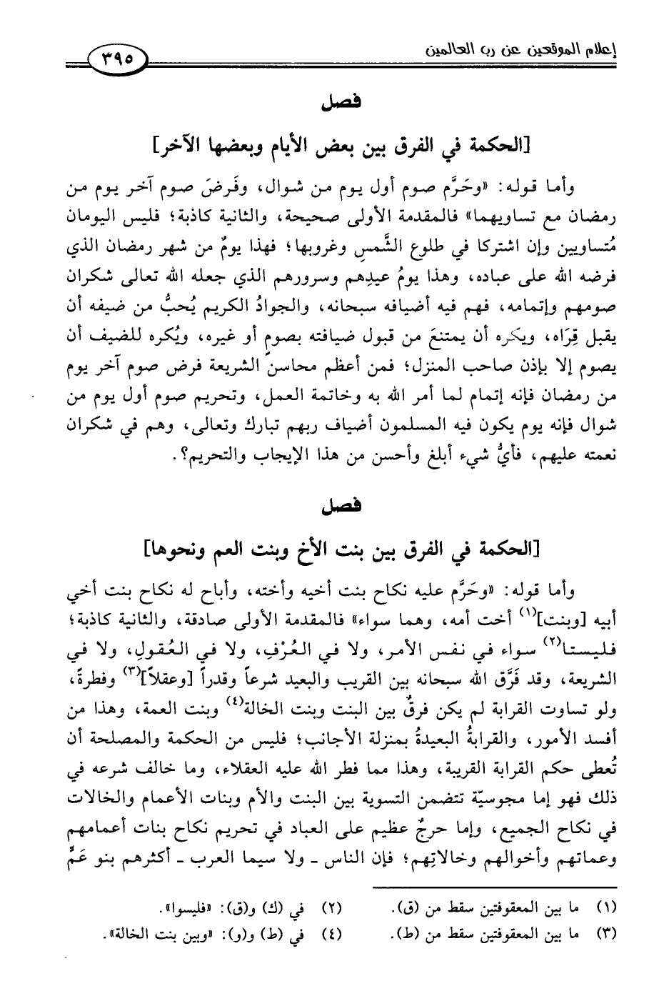 وأما قوله: "وحَرَّم صوم أول يوم من شوال، وفَرضَ صوم آخر يوم من رمضان مع تساويهما" فالمقدمة الأولى صحيحة، والثانية كاذبة؛ فليس اليومان مُتساويين وإن اشتركا في طلوع الشَّمسِ وغروبها؛ فهذا يومٌ من شهر رمضان الذي فرضه اللَّه على عباده، وهذا يومُ عيدِهم وسرورهم الذي جعله اللَّه تعالى شكران صومهم وإتمامه، فهم فيه أضيافه سبحانه، والجوادُ الكريم يُحب من ضيفه أن يقبل قِرَاه، ويكره أن يمتنعَ من قبول ضيافته بصومٍ أو غيره، ويُكره للضيف أن يصوم إلا بإذن صاحب المنزل؛ فمن أعظم محاسن الشريعة فرض صوم آخر يوم من رمضان فإنه إتمام لما أمر اللَّه به وخاتمة العمل، وتحريم صوم أول يوم من شوال فإنه يوم يكون فيه المسلمون أضياف ربهم تبارك وتعالى، وهم في شكران نعمته عليهم، فأيُّ شيء أبلغ وأحسن من هذا الإيجاب والتحريم؟.