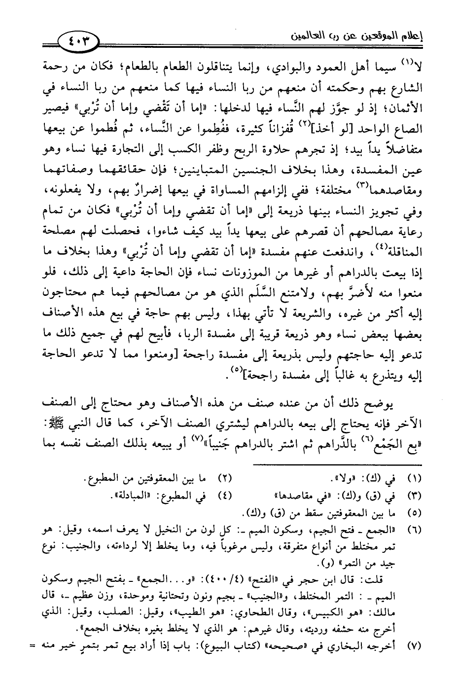 لا (١) سيما أهل العمود والبوادي، وإنما يتناقلون الطعام بالطعام؛ فكان من رحمة الشارع بهم وحكمته أن منعهم من ربا النساء فيها كما منعهم من ربا النساء في الأثمان؛ إذ لو جوَّز لهم النَّساء فيها لدخلها: "إما أن تَقْضي وإما أن تُرْبي" فيصير الصاع الواحد [لو أخذ] (٢) قُفزانًا كثيرة، ففُطِموا عن النساء، ثم فُطموا عن بيعها متفاضلًا يدًا بيد؛ إذ تجرهم حلاوة الربح وظفر الكسب إلى التجارة فيها نساء وهو عين المفسدة، وهذا بخلاف الجنسين المتباينين؛ فإن حقائقهما وصفاتهما ومقاصدهما (٣) مختلفة؛ ففي إلزامهم المساواة في بيعها إضرارٌ بهم، ولا يفعلونه، وفي تجويز النساء بينها ذريعة إلى "إما أن تقضي وإما أن تُرْبي" فكان من تمام رعاية مصالحهم أن قصرهم على بيعها يدًا بيد كيف شاءوا، فحصلت لهم مصلحة المناقلة (٤)، واندفعت عنهم مفسدة "إما أن تقضي وإما أن تُرْبي" وهذا بخلاف ما إذا بيعت بالدراهم أو غيرها من الموزونات نساء فإن الحاجة داعية إلى ذلك، فلو منعوا منه لأَضرَّ بهم، ولامتنع السَّلَم الذي هو من مصالحهم فيما هم محتاجون إليه أكثر من غيره، والشريعة لا تأتي بهذا، وليس بهم حاجة في بيع هذه الأصناف بعضها ببعض نساء وهو ذريعة قريبة إلى مفسدة الربا، فأبيح لهم في جميع ذلك ما تدعو إليه حاجتهم وليس بذريعة إلى مفسدة راجحة [ومنعوا مما لا تدعو الحاجة إليه ويتذرع به غالبًا إلى مفسدة راجحة] (٥).