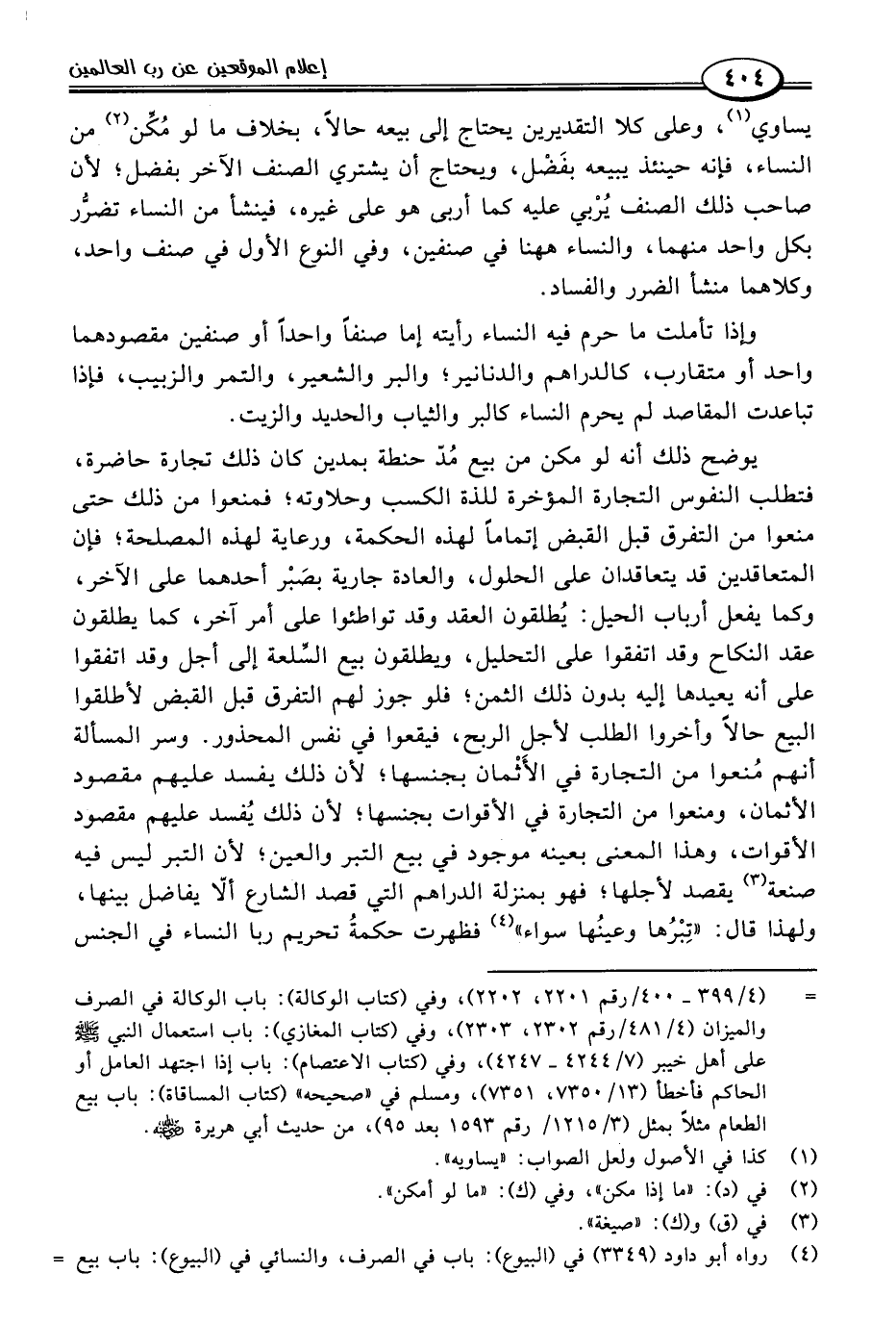 يوضح ذلك أنه لو مكن من بيع مُدّ حنطة بمدين كان ذلك تجارة حاضرة، فتطلب النفوس التجارة المؤخرة للذة الكسب وحلاوته؛ فمنعوا من ذلك حتى منعوا من التفرق قبل القبض إتماما لهذه الحكمة، ورعاية لهذه المصلحة؛ فإن المتعاقدين قد يتعاقدان على الحلول، والعادة جارية بصَبْر أحدهما على الآخر، وكما يفعل أرباب الحيل: يُطلقون العقد وقد تواطئوا على أمر آخر، كما يطلقون عقد النكاح وقد اتفقوا على التحليل، ويطلقون بيع السلعة إلى أجل وقد اتفقوا على أنه يعيدها إليه بدون ذلك الثمن؛ فلو جوز لهم التفرق قبل القبض لأطلقوا البيع حالًا وأخروا الطلب لأجل الربح، فيقعوا في نفس المحذور. وسر المسألة أنهم مُنعوا من التجارة في الأَثْمان بجنسها؛ لأن ذلك يفسد عليهم مقصود الأثمان، ومنعوا من التجارة في الأقوات بجنسها؛ لأن ذلك يُفسد عليهم مقصود الأقوات، وهذا المعنى بعينه موجود في بيع التبر والعين؛ لأن التبر ليس فيه صنعة (٣) يقصد لأجلها؛ فهو بمنزلة الدراهم التي قصد الشارع ألا يفاضل بينها، ولهذا قال: "تِبْرُها وعينُها سواء" (٤) فظهرت حكمةُ تحريم ربا النساء في الجنس