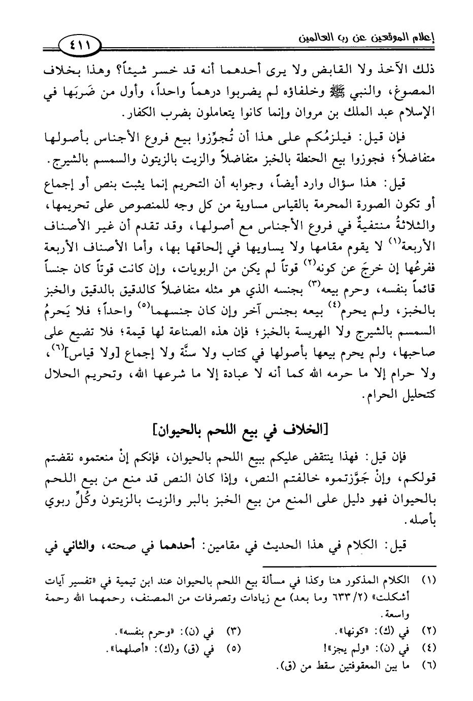 (١) الكلام المذكور هنا وكذا في مسألة بيع اللحم بالحيوان عند ابن تيمية في "تفسير آيات أشكلت" (٢/ ٦٣٣ وما بعد) مع زيادات وتصرفات من المصنف، رحمهما اللَّه رحمة واسعة.