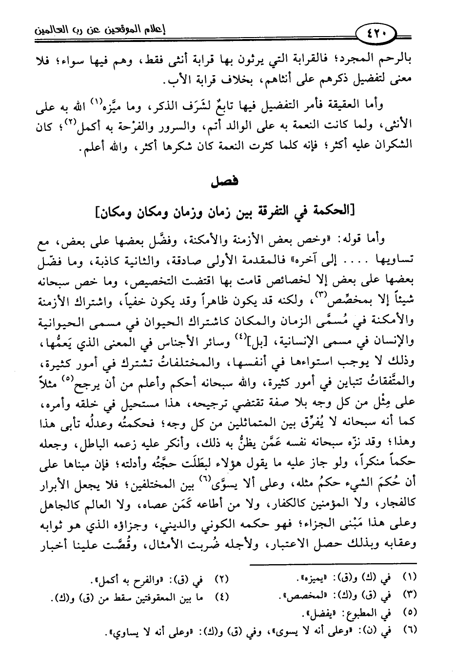 وأما قوله: "وخص بعض الأزمنة والأمكنة، وفضل بعضها على بعض، مع تساويها. . . إلى آخره" فالمقدمة الأولى صادقة، والثانية كاذبة، وما فضّل بعضها على بعض إلا لخصائص قامت بها اقتضت التخصيص، وما خص سبحانه شيئًا إلا بمخصِّص (٣)، ولكنه قد يكون ظاهرًا وقد يكون خفيًا، واشتراك الأزمنة والأمكنة في مُسمَّى الزمان والمكان كاشتراك الحيوان في مسمى الحيوانية والإنسان في مسمى الإنسانية، [بل] (٤) وسائر الأجناس في المعنى الذي يَعمُّها، وذلك لا يوجب استواءها في أنفسها، والمختلفاتُ تشترك في أمور كثيرة، والمتَّفقاتُ تتباين في أمور كثيرة، واللَّه سبحانه أحكم وأعلم من أن يرجح (٥) مثلًا على مِثْل من كل وجه بلا صفة تقتضي ترجيحه، هذا مستحيل في خلقه وأمره، كما أنه سبحانه لا يُفرِّق بين المتمائلين من كل وجه؛ فحكمتُه وعدلُه تأبى هذا وهذا؛ وقد نزّه سبحانه نفسه عَمَّن يظنُّ به ذلك، وأنكر عليه زعمه الباطل، وجعله حكمًا منكرًا، ولو جاز عليه ما يقول هؤلاء لبطَلَت حجَّتُه وأدلته؛ فإن مبناها على أن حُكمَ الشيء حكمُ مثله، وعلى ألا يسوَّى (٦) بين المختلفين؛ فلا يجعل الأبرار كالفجار، ولا المؤمنين كالكفار، ولا من أطاعه كَمَن عصاه، ولا العالم كالجاهل وعلى هذا مَبْنى الجزاء؛ فهو حكمه الكوني والديني، وجزاؤه الذي هو ثوابه وعقابه وبذلك حصل الاعتبار، ولأجله ضُربت الأمثال، وقُصَّت علينا أخبار