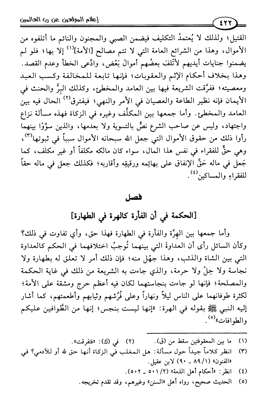 وأما جمعها بين الهِرَّة والفأرة في الطهارة فهذا حق، وأي تفاوت في ذلك؟ وكأن السائل رأى أن العداوةَ التي بينهما تُوجبُ اختلافهما في الحكم كالعداوة التي بين الشاة والذئب، وهذا جهْل منه؛ فإن ذلك أمر لا تعلق له بطهارة ولا نجاسة ولا حِلّ ولا حرمة، والذي جاءت به الشريعة من ذلك في غاية الحكمة والمصلحة؛ فإنها لو جاءت بنجاستهما لكان فيه أعظم حرج ومشقة على الأمة؛ لكثرة طوفانهما على الناس ليلًا ونهارًا وعلى فُرُشهم وثيابهم وأطعمتهم، كما أشار إليه النبي -صلى اللَّه عليه وسلم- بقوله في الهرة: "إنها ليست بنجس؛ إنها من الطَّوافين عليكم والطوافات" (٥).