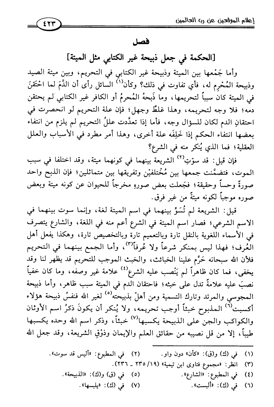 وأما جَمْعها بين الميتة وذبيحة غير الكتابي في التحريم، وبين ميتة الصيد وذبيحة المُحْرِم له، فأي تفاوت في ذلك؟ وكأن (١) السائل رأى أن الدَّمَ لما احْتَقنَ في الميتة كان سببًا لتحريمها، وما ذَبحهُ المُحرمُ أو الكافر غير الكتابي لم يحتقن دمه؛ فلا وجه لتحريمه، وهذا غلطٌ وجهل؛ فإن علة التحريم لو انحصرت في احتقانِ الدم لكان للسؤال وجه، فأما إذا تعدَّدت عللُ التحريم لم يلزم من انتفاء بعضها انتفاء الحكم إذا خَلِفَه علة أخرى، وهذا أمر مطرد في الأسباب والعلل العقلية؛ فما الذي يُنكر منه في الشرع؟