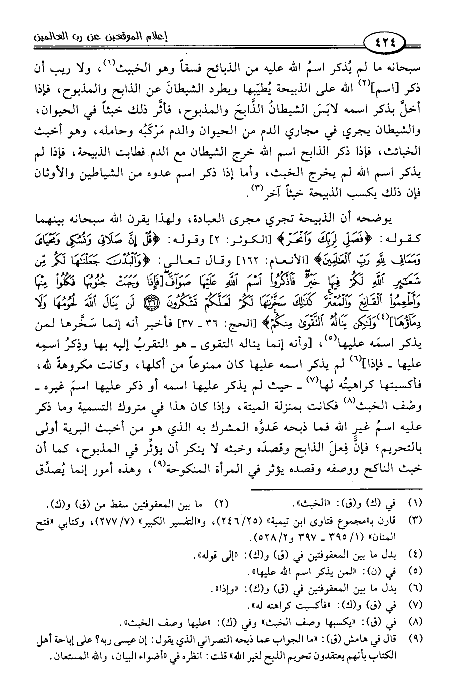يوضحه أن الذبيحة تجري مجرى العبادة، ولهذا يقرن اللَّه سبحانه بينهما كقوله: {فَصَلِّ لِرَبِّكَ وَانْحَرْ} [الكوثر: ٢] وقوله: {قُلْ إِنَّ صَلَاتِي وَنُسُكِي وَمَحْيَايَ وَمَمَاتِي لِلَّهِ رَبِّ الْعَالَمِينَ} [الأنعام: ١٦٢] وقال تعالي: {وَالْبُدْنَ جَعَلْنَاهَا لَكُمْ مِنْ شَعَائِرِ اللَّهِ لَكُمْ فِيهَا خَيْرٌ فَاذْكُرُوا اسْمَ اللَّهِ عَلَيْهَا صَوَافَّ [فَإِذَا وَجَبَتْ جُنُوبُهَا فَكُلُوا مِنْهَا وَأَطْعِمُوا الْقَانِعَ وَالْمُعْتَرَّ كَذَلِكَ سَخَّرْنَاهَا لَكُمْ لَعَلَّكُمْ تَشْكُرُونَ (٣٦) لَنْ يَنَالَ اللَّهَ لُحُومُهَا وَلَا دِمَاؤُهَا] (٤) وَلَكِنْ يَنَالُهُ التَّقْوَى مِنْكُمْ} [الحج: ٣٦ - ٣٧] فأخبر أنه إنما سَخَّرها لمن يذكر اسمَه عليها (٥)، [وأنه إنما يناله التقوى -هو التقربُ إليه بها وذِكرُ اسمِه عليها- فإذا] (٦) لم يذكر اسمه عليها كان ممنوعًا من أكلها، وكانت مكروهةً للَّه، فأكسبتها كراهيتُه لها (٧) -حيث لم يذكر عليها اسمه أو ذكر عليها اسمَ غيره- وصْف الخبث (٨) فكانت بمنزلة الميتة، وإذا كان هذا في متروك التسمية وما ذكر عليه اسمُ غيرِ اللَّه فما ذبحه عَدوُّه المشرك به الذي هو من أخبث البرية أولى بالتحريم؛ فإنَّ فِعلَ الذابح وقصدَه وخبثه لا ينكر أن يؤثِّر في المذبوح، كما أن خبث الناكح ووصفه وقصده يؤثر في المرأة المنكوحة (٩)، وهذه أمور إنما يُصدِّق