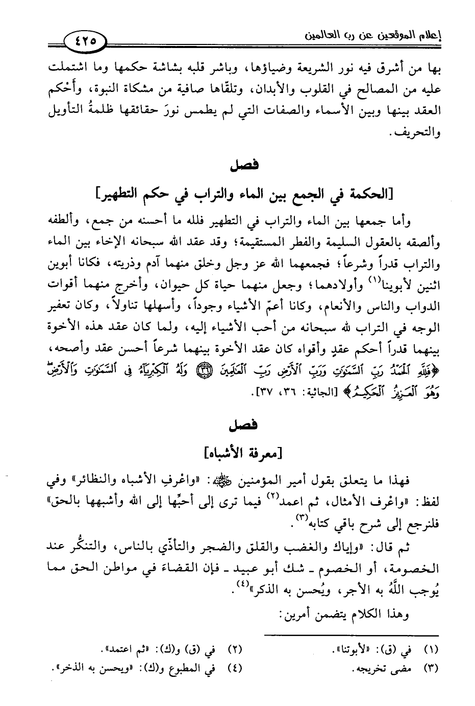 وأما جمعها بين الماء والتراب في التطهير فلله ما أحسنه من جمع، وألطفه وألصقه بالعقول السليمة والفطر المستقيمة؛ وقد عقد اللَّه سبحانه الإخاء بين الماء والتراب قدرًا وشرعًا؛ فجمعهما اللَّه عز وجل وخلق منهما آدم وذريته، فكانا أبوين اثنين لأبوينا (١) وأولادهما؛ وجعل منهما حياة كل حيوان، وأخرج منهما أقوات الدواب والناس والأنعام، وكانا أعمّ الأشياء وجودًا، وأسهلها تناولًا، وكان تعفير الوجه في التراب للَّه سبحانه من أحب الأشياء إليه، ولما كان عقد هذه الأخوة بينهما قدرًا أحكم عقدٍ وأقواه كان عقد الأخوة بينهما شرعًا أحسن عقد وأصحه، {فَلِلَّهِ الْحَمْدُ رَبِّ السَّمَاوَاتِ وَرَبِّ الْأَرْضِ رَبِّ الْعَالَمِينَ (٣٦) وَلَهُ الْكِبْرِيَاءُ فِي السَّمَاوَاتِ وَالْأَرْضِ وَهُوَ الْعَزِيزُ الْحَكِيمُ} [الجاثية: ٣٦ - ٣٧].