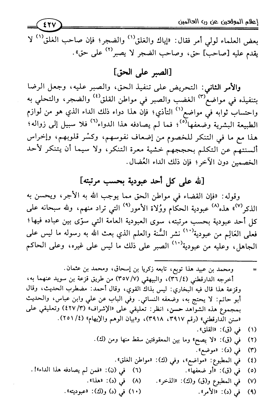 وقوله: "فإن القضاء في مواطن الحق مما يوجب اللَّه به الأجر، ويحسن به الذكر (٧) " هذه (٨) عبودية الحكام ووُلاة الأمور (٩) التي تراد منهم، وللَّه سبحانه على كل أحد عبودية بحسب مرتبته، سوى العبودية العامة التي سوّى بين عباده فيها؛ فعلى العَالِم من عبودية (١٠) نشر السُّنة والعلم الذي بعث اللَّه به رسوله ما ليس على الجاهل، وعليه من عبودية (١٠) الصبر على ذلك ما ليس على غيره، وعلى الحاكم