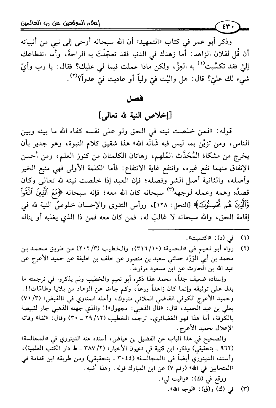 (٢) رواه أبو نعيم في "الحلية" (١٠/ ٣١٦)، والخطيب (٣/ ٢٠٢) من طريق محمد بن محمد بن أبي الوَرْد حدثني سعيد بن منصور عن خلف بن خليفة عن حميد الأعرج عن عبد اللَّه بن الحارث عن ابن مسعود مرفوعًا.