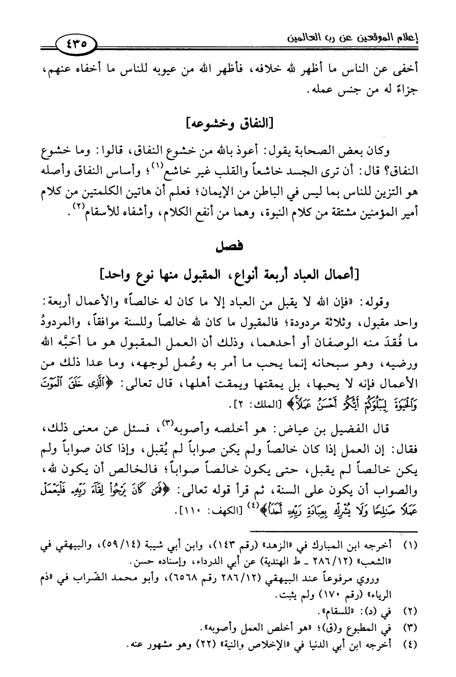 وقوله: "فإن اللَّه لا يقبل من العباد إلا ما كان له خالصًا" والأعمال أربعة: واحد مقبول، وثلاثة مردودة؛ فالمقبول ما كان للَّه خالصًا وللسنة موافقًا، والمردودُ ما فُقدَ منه الوصفان أو أحدهما، وذلك أن العمل المقبول هو ما أحَبَّه اللَّه ورضيه، وهو سبحانه إنما يحب ما أمر به وعُمل لوجهه، وما عدا ذلك من الأعمال فإنه لا يحبها، بل يمقتها ويمقت أهلها، قال تعالى: {الَّذِي خَلَقَ الْمَوْتَ وَالْحَيَاةَ لِيَبْلُوَكُمْ أَيُّكُمْ أَحْسَنُ عَمَلًا} [الملك: ٢].
