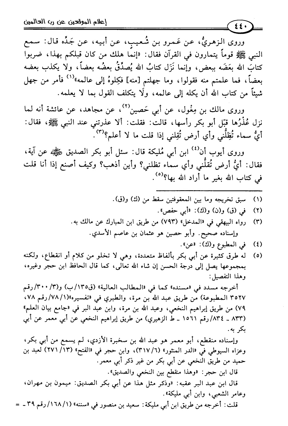 وروى الزهريُّ، عن عَمرو بن شُعيب، عن أبيه، عن جَدِّه قال: سمع النبي -صلى اللَّه عليه وسلم- قومًا يتمارون في القرآن فقال: "إنما هلك من كان قبلكم بهذا، ضربوا كتابَ اللَّه بعَضَه ببعض، وإنما نَزَل كتابُ اللَّه يُصدِّقُ بعضُه بعضًا، ولا يكذب بعضه بعضًا، فما علمتم منه فقولوا، وما جهلتم [منه] فكِلوهُ إلى عالمه" (١) فأمر من جهل شيئًا من كتاب اللَّه أن يكله إلى عالمه، ولَا يتكلف القول بما لا يعلمه.