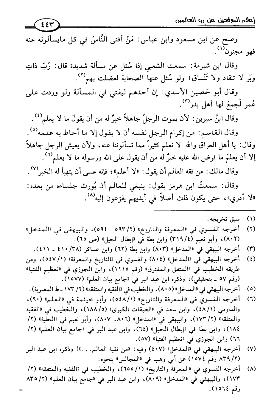 (٦) أخرجه الفسوي في "المعرفة والتاريخ" (١/ ٥٤٨)، وأبو خيثمة في "العلم" (٩٠)، والدارمي (١/ ٤٨)، وابن سعد في "الطبقات الكبرى" (٥/ ١٨٨)، والخطيب في "الفقيه والمتفقه" (٢/ ١٧٣)، والبيهقي في "المدخل" (٨٠٦، ٨٠٧)، وأبو نعيم في "الحلية" (٢/ ١٨٤)، وابن بطة في "إبطال الحيل" (٦٤)، وابن عبد البر في "جامع بيان العلم" (٢/ ٦٦) وابن الجوزي في "تعظيم الفتيا" (٥٧).