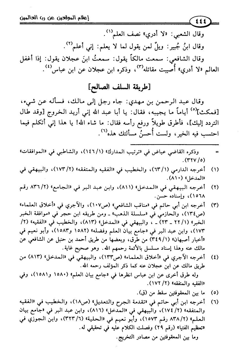 (٦) أخرجه ابن أبي حاتم في "تقدمة الجرح والتعديل" (ص ١٨)، والخطيب في "الفقيه والمتفقه" (٢/ ١٧٤)، والبيهقي في "المدخل" (٨١٦)، وابن عبد البر في "جامع بيان العلم" (٢/ ٨٣٨ رقم ١٥٧٣)، وأبو نعيم في "الحلية" (٦/ ٣٢٣)، وابن الجوزي في "تعظيم الفتيا" (رقم ٢٩) وفصلت الكلام عليه في تحقيقي له.