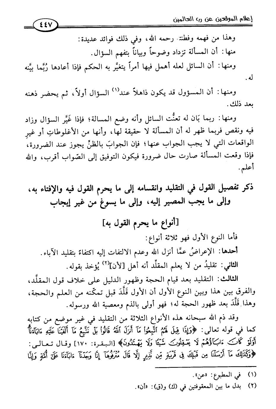 وقد ذم اللَّه سبحانه هذه الأنواع الثلاثة من التقليد في غير موضع من كتابه كما في قوله تعالى: {وَإِذَا قِيلَ لَهُمُ اتَّبِعُوا مَا أَنْزَلَ اللَّهُ قَالُوا بَلْ نَتَّبِعُ مَا أَلْفَيْنَا عَلَيْهِ آبَاءَنَا أَوَلَوْ كَانَ آبَاؤُهُمْ لَا يَعْقِلُونَ شَيْئًا وَلَا يَهْتَدُونَ} [البقرة: ١٧٠] وقال تعالى: {وَكَذَلِكَ مَا أَرْسَلْنَا مِنْ قَبْلِكَ فِي قَرْيَةٍ مِنْ نَذِيرٍ إِلَّا قَالَ مُتْرَفُوهَا إِنَّا وَجَدْنَا آبَاءَنَا عَلَى أُمَّةٍ وَإِنَّا