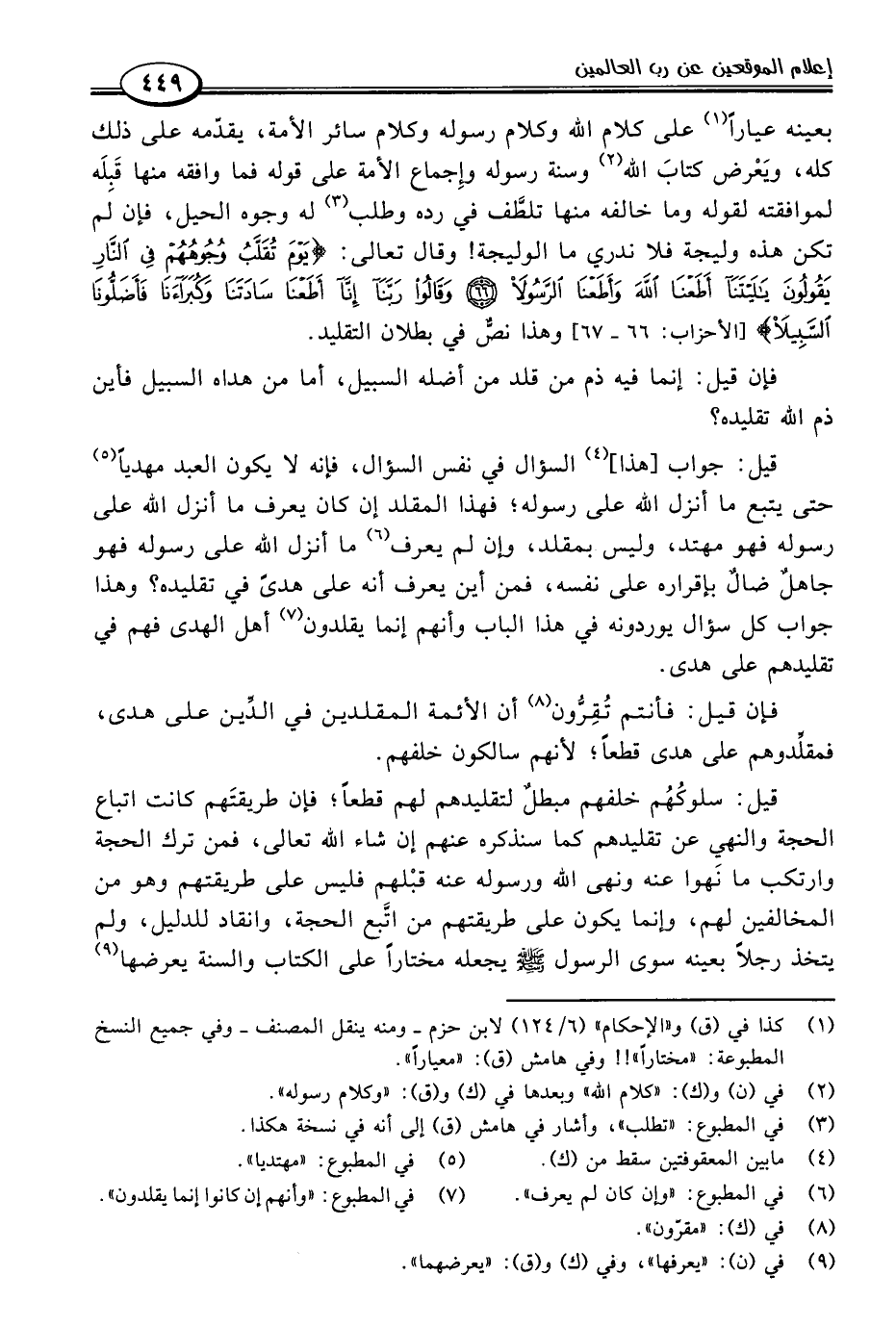 بعينه عيارًا (١) على كلام اللَّه وكلام رسوله وكلام سائر الأمة، يقدّمه على ذلك كله، ويَعْرض كتابَ اللَّه (٢) وسنة رسوله وإِجماع الأمة على قوله فما وافقه منها قَبِلَه لموافقته لقوله وما خالفه منها تلطَّف في رده وطلب (٣) له وجوه الحيل، فإن لم تكن هذه وليجة فلا ندري ما الوليجة! وقال تعالى: {يَوْمَ تُقَلَّبُ وُجُوهُهُمْ فِي النَّارِ يَقُولُونَ يَالَيْتَنَا أَطَعْنَا اللَّهَ وَأَطَعْنَا الرَّسُولَا (٦٦) وَقَالُوا رَبَّنَا إِنَّا أَطَعْنَا سَادَتَنَا وَكُبَرَاءَنَا فَأَضَلُّونَا السَّبِيلَا} [الأحزاب: ٦٦ - ٦٧] وهذا نصٌّ في بطلان التقليد.