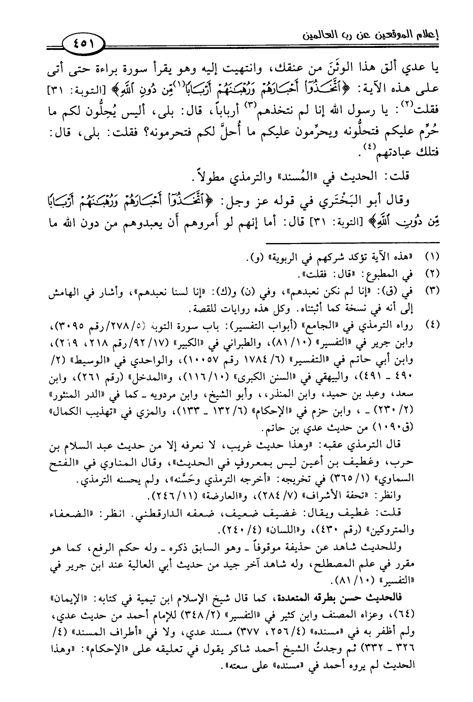 (٤) رواه الترمذي في "الجامع" (أبواب التفسير): باب سورة التوبة (٥/ ٢٧٨/ رقم ٣٠٩٥)، وابن جرير في "التفسير" (١٠/ ٨١)، والطبراني في "الكبير" (١٧/ ٩٢/ رقم ٢١٨، ٢١٩)، وابن أبي حاتم في "التفسير" (٦/ ١٧٨٤ رقم ١٠٠٥٧)، والواحدي في "الوسيط" (٢/ ٤٩٠ - ٤٩١)، والبيهقي في "السنن الكبرى" (١٠/ ١١٦)، و"المدخل" (رقم ٢٦١)، وابن سعد، وعبد بن حميد، وابن المنذر، وأبو الشيخ، وابن مردويه -كما في "الدر المنثور" (٢/ ٢٣٠) -، وابن حزم في "الإحكام" (٦/ ١٣٢ - ١٣٣)، والمزي في "تهذيب الكمال" (ق ١٠٩٠) من حديث عدي بن حاتم.