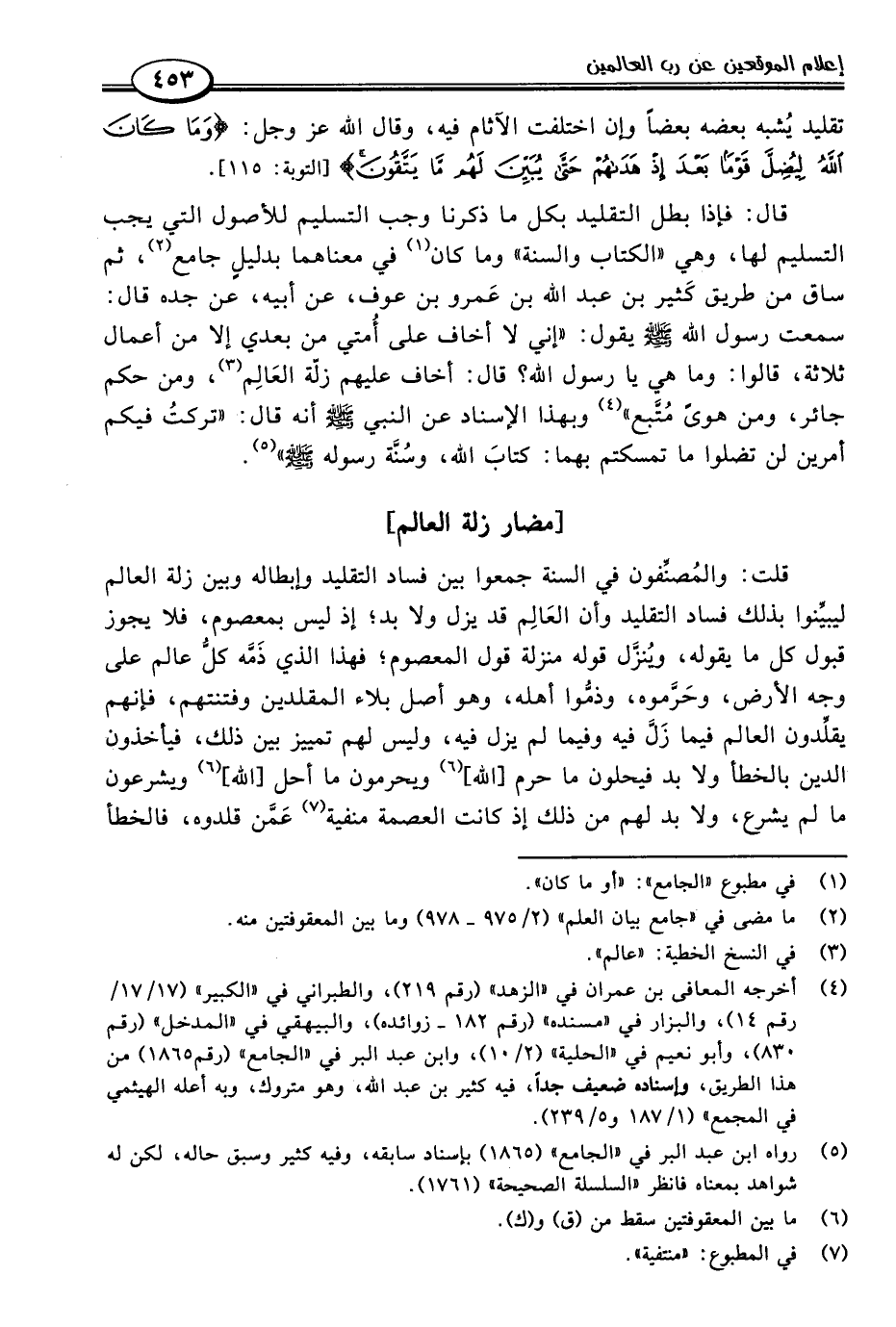 قلت: والمُصنِّفون في السنة جمعوا بين فساد التقليد وإبطاله وبين زلة العالم ليبيِّنوا بذلك فساد التقليد وأن العَالِم قد يزل ولا بد؛ إذ ليس بمعصوم، فلا يجوز قبول كل ما يقوله، ويُنزَّل قوله منزلة قول المعصوم؛ فهذا الذي ذَمَّه كلُّ عالم على وجه الأرض، وحَرَّموه، وذمُّوا أهله، وهو أصل بلاء المقلدين وفتنتهم، فإنهم يقلِّدون العالم فيما زَلَّ فيه وفيما لم يزل فيه، وليس لهم تمييز بين ذلك، فيأخذون الدين بالخطأ ولا بد فيحلون ما حرم [اللَّه] (٦) ويحرمون ما أحل [اللَّه] (٦) ويشرعون ما لم يشرع، ولا بد لهم من ذلك إذ كانت العصمة منفية (٧) عَمَّن قلدوه، فالخطأ