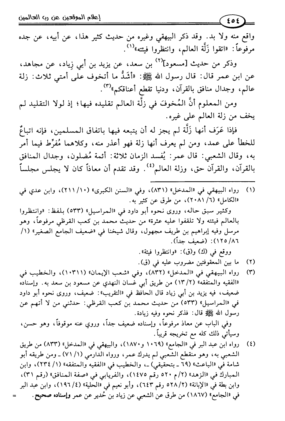 فإذا عَرَف أنها زَلَّة لم يجز له أن يتبعه فيها باتفاق المسلمين، فإنه اتباعٌ للخطأ على عمد، ومن لم يعرف أنها زلة فهو أعذر منه، وكلاهما مُفرِّط فيما أمر به، وقال الشعبي: قال عمر: يُفسد الزمان ثلاثة: أئمة مُضلون، وجدال المنافق بالقرآن، والقرآن حق، وزلة العالم (٤). وقد تقدم أن معاذًا كان لا يجلس مجلسًا