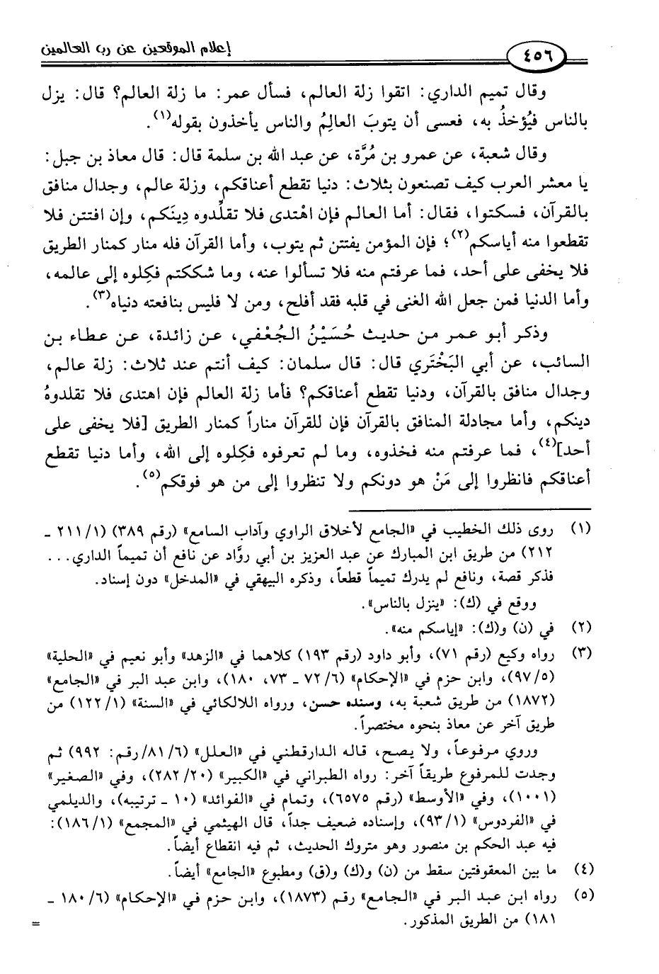 وقال شعبة، عن عمرو بن مُرَّة، عن عبد اللَّه بن سلمة قال: قال معاذ بن جبل: يا معشر العرب كيف تصنعون بثلاث: دنيا تقطع أعناقكم، وزلة عالم، وجدال منافق بالقرآن، فسكتوا، فقال: أما العالم فإن اهْتدى فلا تقلِّدوه دِينَكم، وإن افتتن فلا تقطعوا منه أياسكم (٢)؛ فإن المؤمن يفتتن ثم يتوب، وأما القرآن فله منار كمنار الطريق فلا يخفى على أحد، فما عرفتم منه فلا تسألوا عنه، وما شككتم فكِلوه إلى عالمه، وأما الدنيا فمن جعل اللَّه الغنى في قلبه فقد أفلح، ومن لا فليس بنافعته دنياه (٣).