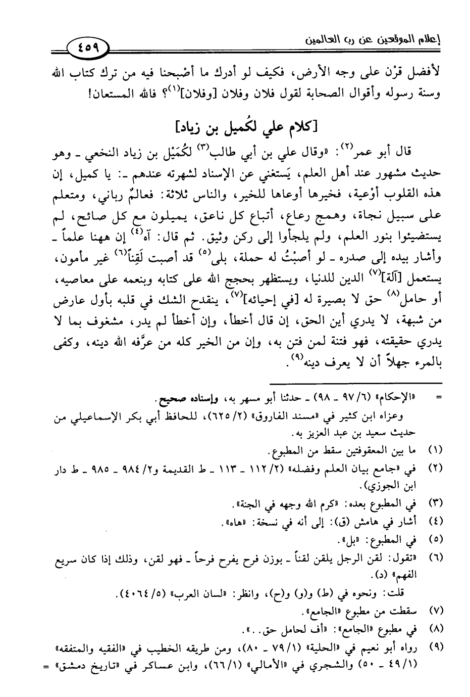 قال أبو عمر (٢): "وقال علي بن أبي طالب (٣) لكُمَيْل بن زياد النخعي -وهو حديث مشهور عند أهل العلم، يَستغني عن الإسناد لشهرته عندهم-: يا كميل، إن هذه القلوب أوْعية، فخيرها أوعاها للخير، والناس ثلاثة: فعالمٌ رباني، ومتعلم على سبيل نجاة، وهمج رعاع، أتباع كل ناعق، يميلون مع كل صائح، لم يستضيئوا بنور العلم، ولم يلجأوا إلى ركن وثيق. ثم قال: آه (٤) إن هاهنا علمًا -وأشار بيده إلى صدره- لو أصبْتُ له حملة، بلى (٥) قد أصبت لَقِنًا (٦) غير مأمون، يستعمل [آلة] (٧) الدين للدنيا، ويستظهر بحجج اللَّه على كتابه وبنعمه على معاصيه، أو حامل (٨) حق لا بصيرة له [في إحيائه] (٧)، ينقدح الشك في قلبه بأول عارض من شبهة، لا يدري أين الحق، إن قال أخطأ، وإن أخطأ لم يدر، مشغوف بما لا يدري حقيقته، فهو فتنة لمن فتن به، وإن من الخير كله من عرَّفه اللَّه دينه، وكفى بالمرء جهلًا أن لا يعرف دينه (٩).
