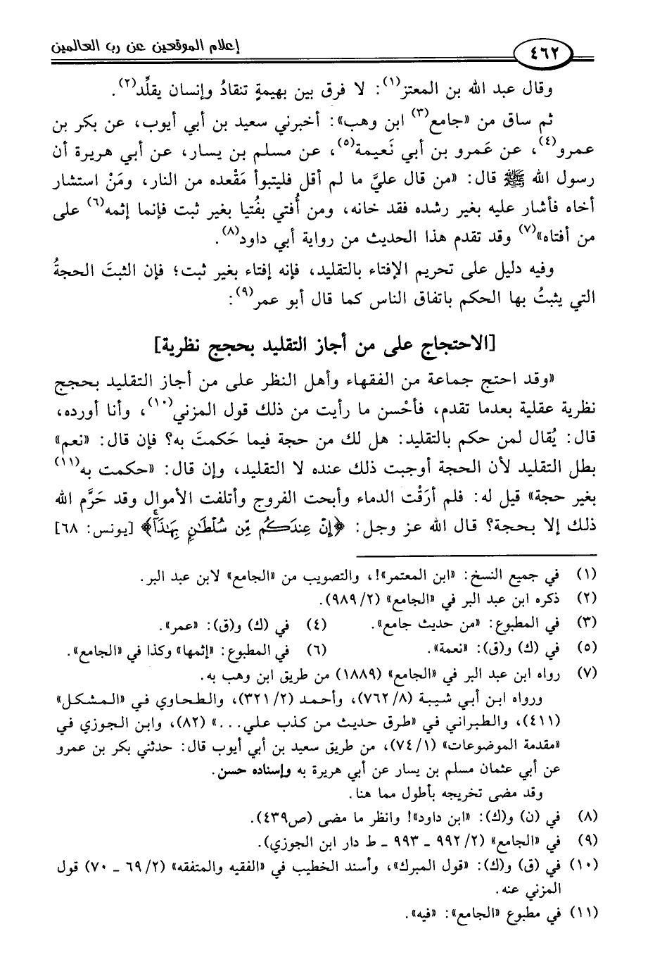 " وقد احتج جماعة من الفقهاء وأهل النظر على من أجاز التقليد بحجج نظرية عقلية بعد ما تقدم، فأحْسن ما رأيت من ذلك قول المزني (١٠)، وأنا أورده، قال: يُقال لمن حكم بالتقليد: هل لك من حجة فيما حَكمتَ به؟ فإن قال: "نعم" بطل التقليد لأن الحجة أوجبت ذلك عنده لا التقليد، وإن قال: "حكمت به (١١) بغير حجة" قيل له: فلم أرَقْت الدماء وأبحت الفروج وأتلفت الأموال وقد حَرَّم اللَّه ذلك إلا بحجة؟ قال اللَّه عَزَّ وَجَلَّ: {إِنْ عِنْدَكُمْ مِنْ سُلْطَانٍ بِهَذَا} [يونس: ٦٨]