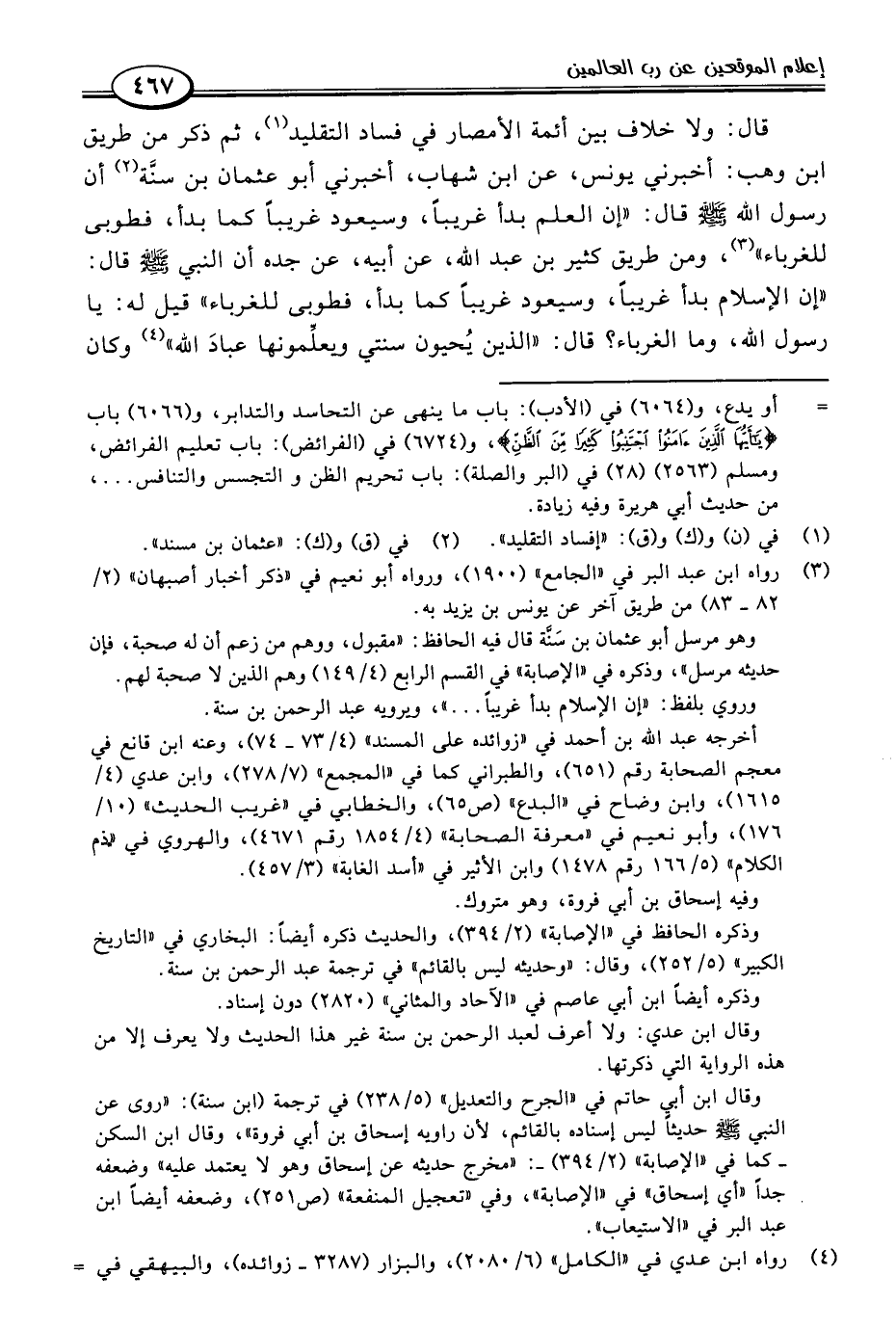 قال: ولا خلاف بين أئمة الأمصار في فساد التقليد (١)، ثم ذكر من طريق ابن وهب: أخبرني يونس، عن ابن شهاب، أخبرني أبو عثمان بن سنَّة (٢) أن رسول اللَّه -صلى اللَّه عليه وسلم- قال: "إن العلم بدأ غريبًا، وسيعود غريبًا كما بدأ، فطوبى للغرباء" (٣)، ومن طريق كثير بن عبد اللَّه، عن أبيه، عن جده أن النبي -صلى اللَّه عليه وسلم- قال: "إن الإِسلام بدأ غريبًا، وسيعود غريبًا كما بدأ، فطوبى للغرباء" قيل له: يا رسول اللَّه، وما الغرباء؟ قال: "الذين يُحيون سنتي ويعلِّمونها عبادَ اللَّه" (٤) وكان
