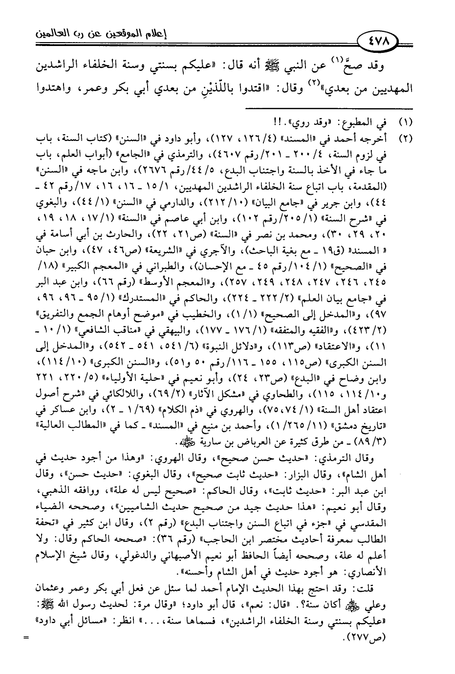 قلت: وقد احتج بهذا الحديث الإِمام أحمد لما سئل عن فعل أبي بكر وعمر وعثمان وعلي -رضي الله عنهم- أكان سنة؟. "قال: نعم"، قال أبو داود؛ "وقال مرة: لحديث رسول اللَّه -صلى اللَّه عليه وسلم-: "عليكم بسنتي وسنة الخلفاء الراشدين"، فسماها سنة،. . . " انظر: "مسائل أبي داود" (ص ٢٧٧). =