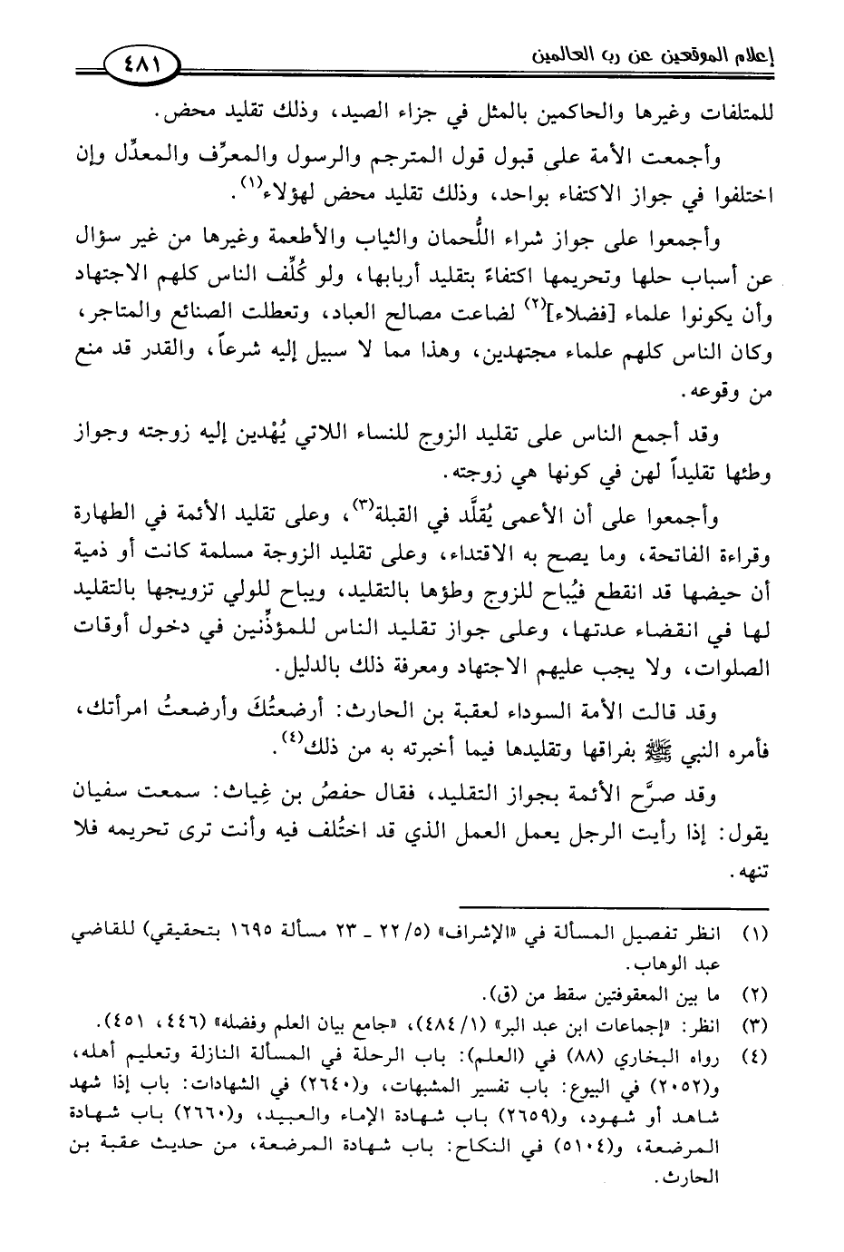 وأجمعوا على جواز شراء اللُّحمان والثياب والأطعمة وغيرها من غير سؤال عن أسباب حلها وتحريمها اكتفاءً بتقليد أربابها, ولو كُلِّف الناس كلهم الاجتهاد وأن يكونوا علماء [فضلاء] (٢) لضاعت مصالح العباد، وتعطلت الصنائع والمتاجر، وكان الناس كلهم علماء مجتهدين، وهذا مما لا سبيل إليه شرعًا، والقدر قد منع من وقوعه.