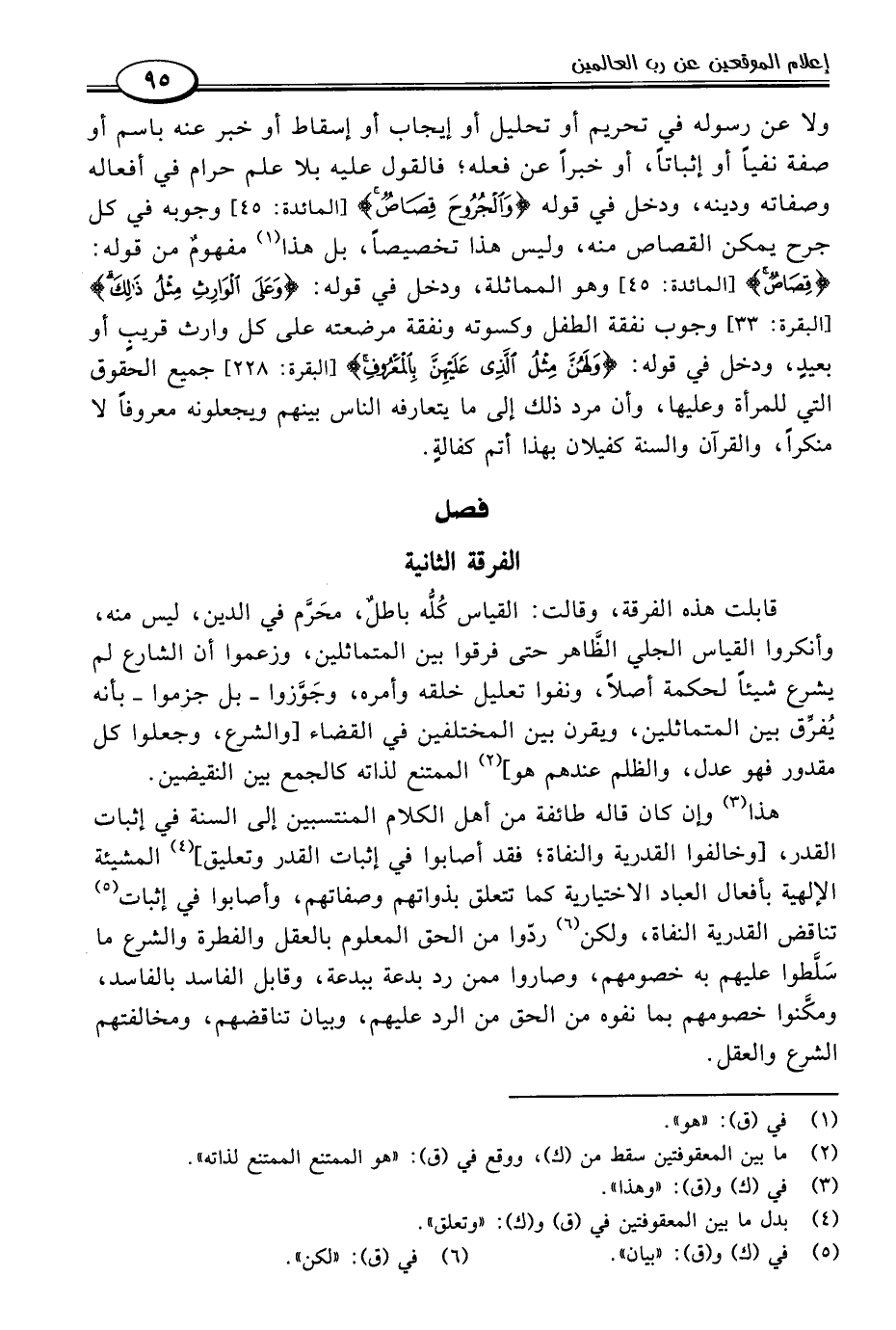 قابلت هذه الفرقة، وقالت: القياس كُلُّه باطلٌ، محَرَّم في الدين، ليس منه، وأنكروا القياس الجلي الظَّاهر حتى فرقوا بين المتماثلين، وزعموا أن الشارع لم يشرع شيئًا لحكمة أصلًا، ونفوا تعليل خلقه وأمره، وجَوَّزوا -بل جزموا- بأنه يُفرّق بين المتماثلين، ويقرن بين المختلفين في القضاء [والشرع، وجعلوا كل مقدور فهو عدل، والظلم عندهم هو] (٢) الممتنع لذاته كالجمع بين النقيضين.