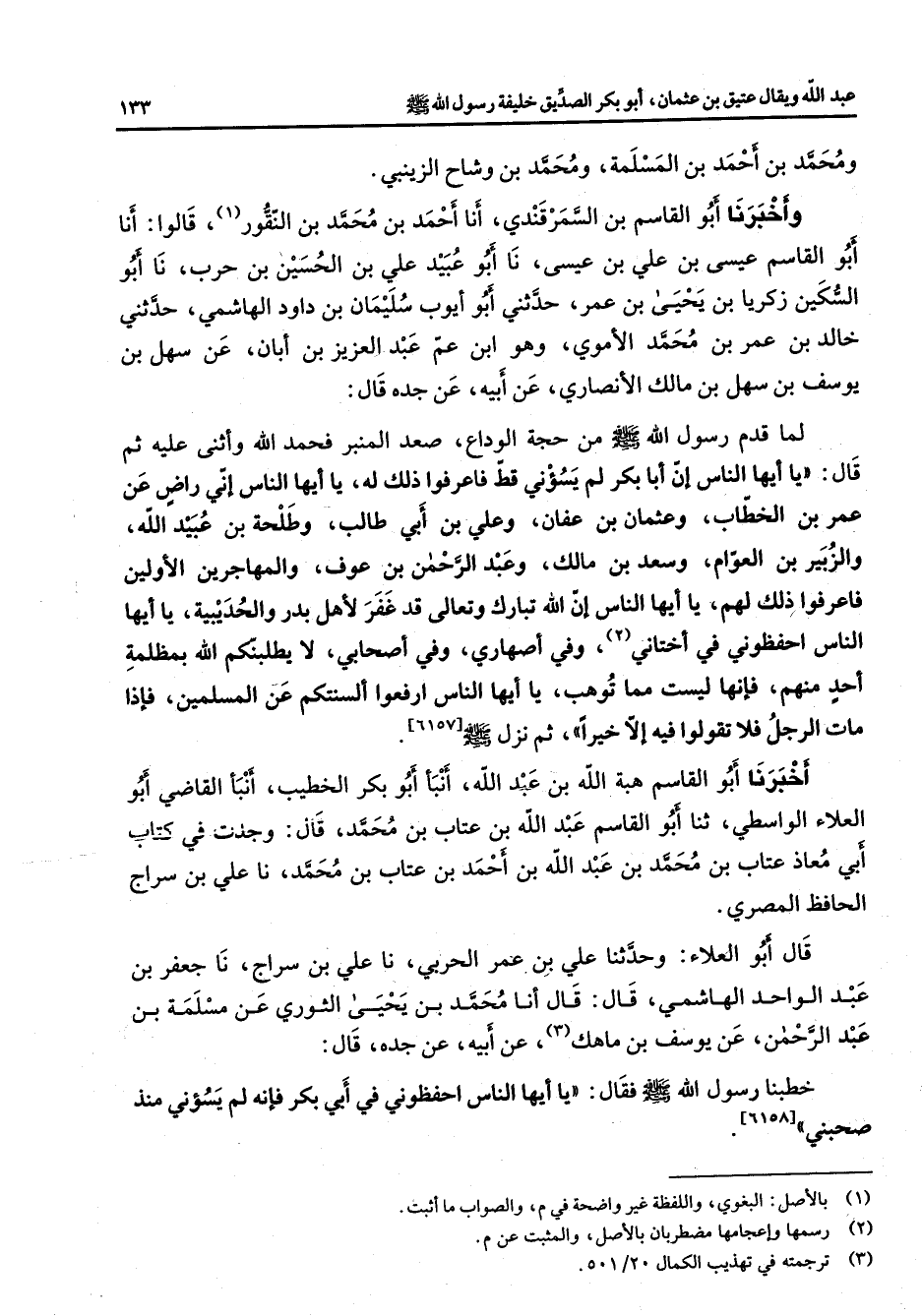 بن أحمد بن المسلمة ومحمد بن وشاح الزينبي وأخبرنا أبو القاسم بن السمرقندي أنا أحمد بن محمد بن النقور (1) قالوا أنا أبو القاسم عيسى بن علي بن عيسى نا أبو عبيد علي بن الحسين بن حرب نا أبو السكين زكريا بن يحيى بن عمر حدثني أبو أيوب سليمان بن داود الهاشمي حدثني خالد بن عمر بن محمد الأموي وهو ابن عم عبد العزيز بن أبان عن سهل بن يوسف بن سهل بن مالك الأنصاري عن أبيه عن جده قال لما قدم رسول الله (صلى الله عليه وسلم) من حجة الوداع صعد المنبر فحمد الله وأثنى عليه ثم قال يا أيها الناس إن أبا بكر لم يسؤني قط فاعرفوا ذلك له يا أيها الناس إني راض عن عمر بن الخطاب وعثمان بن عفان وعلي بن أبي طالب وطلحة بن عبيد الله والزبير بن العوام وسعد بن مالك وعبد الرحمن بن عوف والمهاجرين الأولين فاعرفوا ذلك لهم يا أيها الناس إن الله تبارك وتعالى قد غفر لأهل بدر والحديبية يا أيها الناس احفظوني في أختاني (2) وفي أصهاري وفي أصحابي لا يطلبنكم الله بمظلمة أحد منهم فإنها ليست مما توهب يا أيها الناس ارفعوا ألسنتكم عن المسلمين فإذا مات الرجل فلا تقولوا فيه إلا خيرا ثم نزل صلى الله عليه وسلم أخبرنا أبو قاسم هبة الله بن عبد الله أنبأ أبو بكر الخطيب أنبأ القاضي أبو العلاء الواسطي ثنا أبو القاسم عبد الله بن عتاب بن محمد قال وجدت في كتاب أبي معاذ عتاب بن محمد بن عبد الله بن أحمد بن عتاب بن محمد نا علي بن سراج الحافظ المصري قال أبو العلاء وحدثنا علي بن عمر الحربي نا علي بن سراج نا جعفر بن عبد الواحد الهاشمي قال قال أنا محمد بن يحيى الثوري عن مسلمة بن عبد الرحمن عن يوسف بن ماهك (3) عن أبيه عن جده قال خطبنا رسول الله (صلى الله عليه وسلم) فقال يا أيها الناس احفظوني في أبي بكر فإنه لم يسؤني منذ صحبني