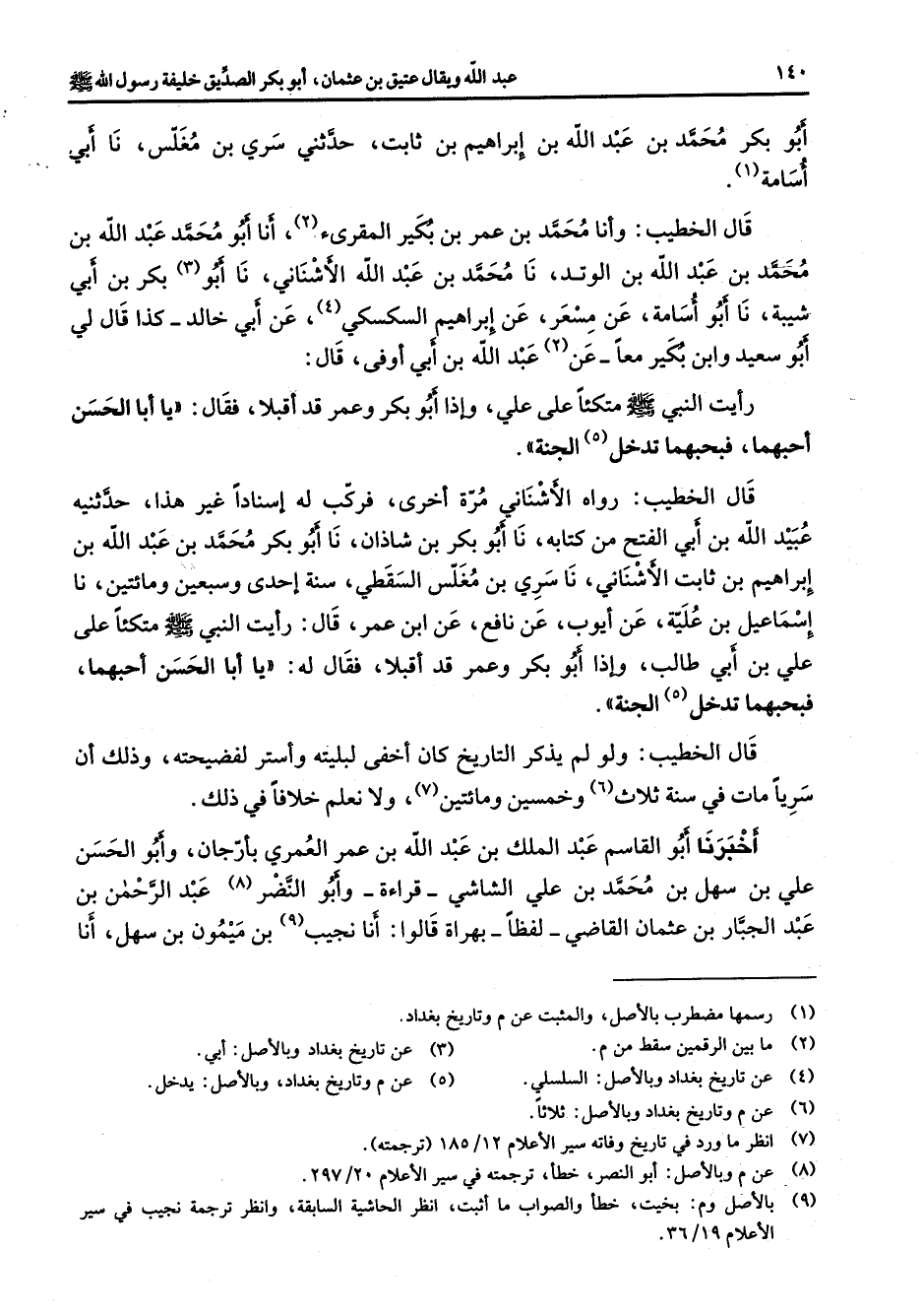 أبو بكر محمد بن عبد الله بن إبراهيم بن ثابت حدثني سري بن مغلس نا أبي أسامة (1) قال الخطيب وأنا محمد بن عمر بن بكير المقرئ (2) أنا أبو محمد عبد الله بن محمد بن عبد الله بن الوتد نا محمد بن عبد الله الأشناني نا أبو (3) بكر بن أبي شيبة نا أبو أسامة عن مسعر عن إبراهيم السكسكي (4) عن أبي خالد كذا قال لي أبو سعيد وابن بكير معا عن (2) عبد الله بن أبي أوفى قال رأيت النبي (صلى الله عليه وسلم) متكئا على علي وإذا أبو بكر وعمر قد أقبلا فقال يا أبا الحسن أحبهما فبحبهما تدخل (5) الجنة قال الخطيب رواه الأشناني مرة أخرى فركب له إسنادا غير هذا حدثنيه عبيد الله بن أبي الفتح من كتابه نا أبو بكر بن شاذان نا أبو بكر محمد بن عبد الله بن إبراهيم بن ثابت الأشناني نا سري بن مغلس السقطي سنة إحدى وسبعين ومائتين نا إسماعيل بن علية عن أيوب عن نافع عن ابن عمر قال رأيت النبي (صلى الله عليه وسلم) متكئا على علي بن أبي طالب وإذا أبو بكر وعمر قد أقبلا فقال له يا أبا الحسن أحبهما فبحبهما تدخل (5) الجنة قال الخطيب ولو لم يذكر التاريخ كان أخفى لبليته وأستر لفضيحته وذلك أن سريا مات في سنة ثلاث (6) وخمسين ومائتين (7) ولا نعلم خلافا في ذلك أخبرنا أبو القاسم عبد الملك بن عبد الله بن عمر العمري بأرجان وأبو الحسن علي بن سهل بن محمد بن علي الشاشي قراءة وأبو النضر (8) عبد الرحمن بن عبد الجبار بن عثمان القاضي لفظا بهراة قالوا أنا نجيب (9) بن ميمون بن سهل أنا