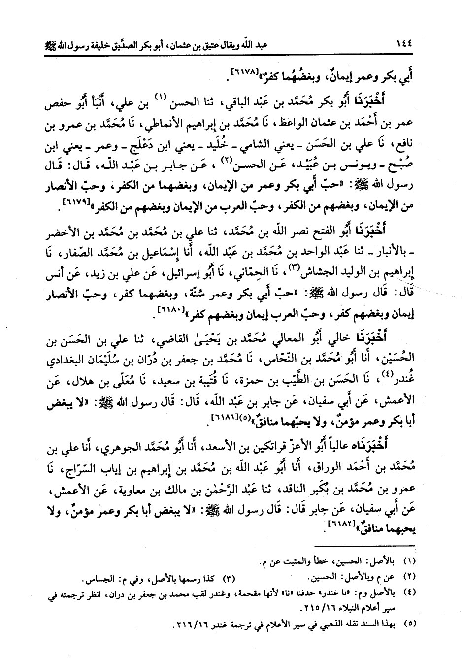 أبي بكر وعمر إيمان وبغضهما كفر أخبرنا أبو بكر محمد بن عبد الباقي ثنا الحسن (1) بن علي أنبأ أبو حفص عمر بن أحمد بن عثمان الواعظ نا محمد بن إبراهيم الأنماطي نا محمد بن عمرو بن نافع نا علي بن الحسن يعني الشامي خليد يعني ابن دعلج وعمر يعني ابن صبح ويونس بن عبيد عن الحسن (2) عن جابر بن عبد الله قال قال رسول الله (صلى الله عليه وسلم) حب أبي بكر وعمر من الإيمان وبغضهما من الكفر وحب الأنصار من الإيمان وبغضهم من الكفر وحب العرب من الإيمان وبغضهم من الكفر أخبرنا أبو الفتح نصر الله بن محمد ثنا علي بن محمد بن محمد بن الأخضر بالأنبار ثنا عبد الواحد بن محمد بن عبد الله أنا إسماعيل بن محمد الصفار نا إبراهيم بن الوليد الجشاش (3) نا الحماني نا أبو إسرائيل عن علي بن زيد عن أيس قال قال رسول الله (صلى الله عليه وسلم) حب أبي بكر وعمر سنة وبغضهما كفر وحب الأنصار إيمان وبغضهم كفر وحب العرب إيمان وبغضهم كفر أخبرنا خالي أبو المعالي محمد بن يحيى القاضي ثنا علي بن الحسن بن الحسين أنا أبو محمد بن النحاس نا محمد بن جعفر بن دران بن سليمان البغدادي غندر (4) نا الحسن بن الطيب بن حمزة نا قتيبة بن سعيد نا معلى بن هلال عن الأعمش عن أبي سفيان عن جابر بن عبد الله قال قال رسول الله (صلى الله عليه وسلم) لا يبغض أبا بكر وعمر مؤمن ولا يحبهما منافق (5) أخبرناه عاليا أبو الأعز قراتكين بن الأسعد أنا أبو محمد الجوهري أنا علي بن محمد بن أحمد الوراق أنا أبو عبد الله بن محمد بن إبراهيم بن إياب السراج نا عمرو بن محمد بن بكير الناقد ثنا عبد الرحمن بن مالك بن معاوية عن الأعمش عن أبي سفيان عن جابر قال قال رسول الله (صلى الله عليه وسلم) لا يبغض أبا بكر وعمر مؤمن ولا يحبهما منافق
