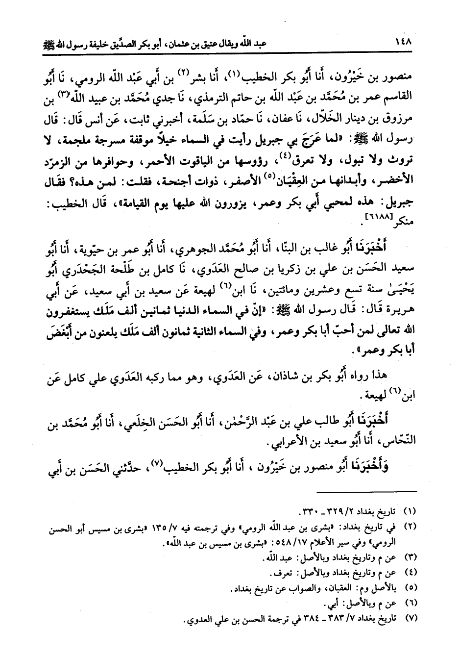 منصور بن خيرون أنا أبو بكر الخطيب (1) أنا بشر (2) بن أبي عبد الله الرومي نا أبو القاسم عمر بن محمد بن عبد الله بن حاتم الترمذي نا جدي محمد بن عبيد الله (3) بن مرزوق بن دينار الخلال نا عفان نا حماد بن سلمة أخبرني ثابت عن أنس قال قال رسول الله (صلى الله عليه وسلم) لما عرج بي جبريل رأيت في السماء خيلا موقفة مسرجة ملجمة لا تروث ولا تبول ولا تعرق (4) رؤوسها من الياقوت الأحمر وحوافرها من الزمرد الأخضر وأبدانها من العقيان (5) الأصفر ذوات أجنحة فقلت لمن هذه فقال جبريل هذه لمحبي أبي بكر وعمر يزورون الله عليها يوم القيامة قال الخطيب منكر أخبرنا أبو غالب بن البنا أنا أبو محمد الجوهري أنا أبو عمر بن حيوية أنا أبو سعيد الحسن بن علي بن زكريا بن صالح العدوي نا كامل بن طلحة الجحدري أبو يحيى سنة تسع وعشرين ومائتين نا ابن (6) لهيعة عن سعيد بن أبي سعيد عن أبي هريرة قال قال رسول الله (صلى الله عليه وسلم) إن في السماء الدنيا ثمانين ألف ملك يستغفرون الله تعالى لمن أحب أبا بكر وعمر وفي السماء الثانية ثمانون ألف ملك يلعنون من أبغض أبا بكر وعمر هذا رواه أبو بكر بن شاذان عن العدوي وهو مما ركبه العدوي علي كامل عن ابن (6) لهيعة أخبرنا أبو طالب علي بن عبد الرحمن أنا أبو الحسن الخلعي أنا أبو محمد بن النحاس أنا أبو سعيد بن الأعرابي وأخبرنا أبو منصور بن خيرون أنا أبو بكر الخطيب (7) حدثني الحسن بن أبي