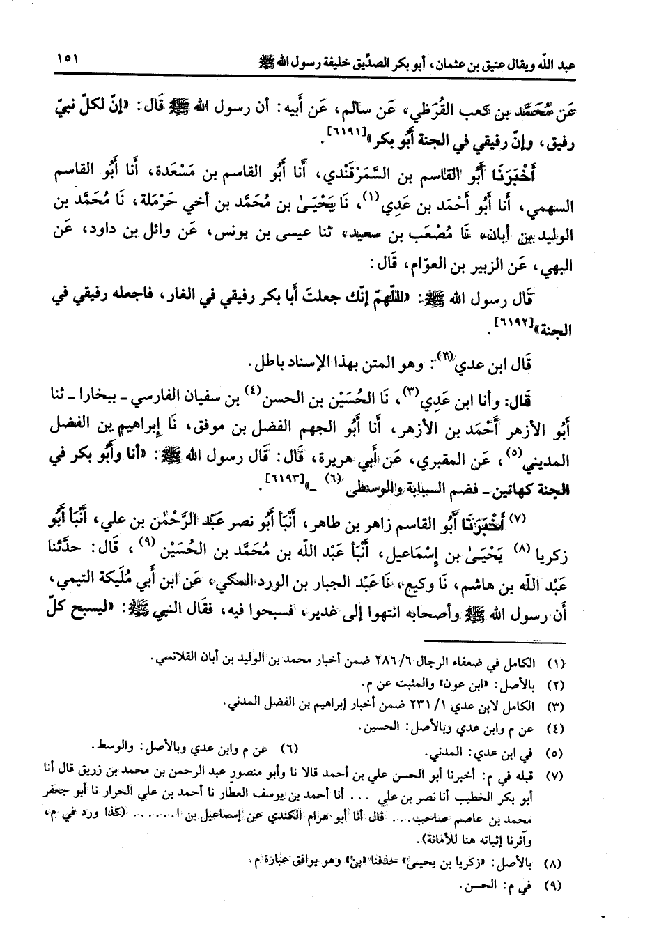 عن محمد بن كعب القرظي عن سالم عن أبيه أن رسول الله (صلى الله عليه وسلم) قال إن لكل نبي رفيق وإن رفيقي في الجنة أبو بكر أخبرنا أبو القاسم بن السمرقندي أنا أبو القاسم بن مسعدة أنا أبو القاسم السهمي أنا أبو أحمد بن عدي (1) نا يحيى بن محمد بن أخي حرملة نا محمد بن الوليد بن أبان نا مصعب بن سعيد ثنا عيسى بن يونس عن وائل بن داود عن البهي عن الزبير بن العوام قال قال رسول الله (صلى الله عليه وسلم) اللهم إنك جعلت أبا بكر رفيقي في الغار فاجعله رفيقي في الجنة قال ابن عدي (2) وهو المتن بهذا الإسناد باطل قال وأنا ابن عدي (3) نا الحسين بن الحسن (4) بن سفيان الفارسي ببخارا ثنا أبو الأزهر أحمد بن الأزهر أنا أبو الجهم الفضل بن موفق نا إبراهيم بن الفضل المديني (5) عن المقبري عن أبي هريرة قال قال رسول الله (صلى الله عليه وسلم) أنا وأبو بكر في الجنة كهاتين فضم السبابة والوسطى (6) (7) أخبرنا أبو القاسم زاهر بن طاهر أنبأ أبو نصر عبد الرحمن بن علي أنبأ أبو زكريا (8) يحيى بن إسماعيل أنبأ عبد الله بن محمد بن الحسين (9) قال حدثنا عبد الله بن هاشم نا وكيع نا عبد الجبار بن الورد المكي عن ابن مليكة التيمي أن رسول الله (صلى الله عليه وسلم) وأصحابه انتهوا إلى غدير فسبحوا فيه فقال النبي (صلى الله عليه وسلم) ليسبح كل