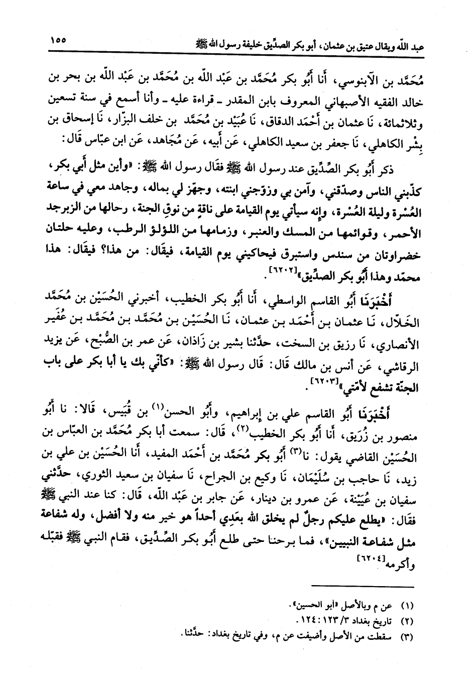 محمد بن الآبنوسي أنا أبو بكر محمد بن عبد الله بن محمد بن عبد الله بن بحر بن خالد الفقيه الأصبهاني المعروف بابن المقدر قراءة عليه وأنا أسمع في سنة تسعين وثلاثمائة نا عثمان بن أحمد الدقاق نا عبيد بن محمد بن خلف البزار نا إسحاق بن بشر الكاهلي نا جعفر بن سعيد الكاهلي عن أبيه عن مجاهد عن ابن عباس قال ذكر أبو بكر الصديق عند رسول الله (صلى الله عليه وسلم) فقال رسول الله (صلى الله عليه وسلم) وأين مثل أبي بكر كذبني الناس وصدقني وآمن بي وزوجني ابنته وجهز لي بماله وجاهد معي في ساعة العسرة وليلة العسرة وإنه سيأتي يوم القيامة على ناقة من نوق الجنة رحالها من الزبرجد الأحمر وقوائمها من المسك والعنبر وزمامها من اللؤلؤ الرطب وعليه حلتان خضراوتان من سندس واستبرق فيحاكيني يوم القيامة فيقال من هذا فيقال هذا محمد وهذا أبو بكر الصديق أخبرنا أبو القاسم الواسطي أنا أبو بكر الخطيب أخبرني الحسين بن محمد الخلال نا عثمان بن أحمد بن عثمان نا الحسين بن محمد بن محمد بن عفير الأنصاري نا زريق بن السخت حدثنا بشير بن زاذان عن عمر بن الصبح عن يزيد الرقاشي عن أنس بن مالك قال قال رسول الله (صلى الله عليه وسلم) كأني بك يا أبا بكر على باب الجنة تشفع لأمتي أخبرنا أبو القاسم علي بن إبراهيم وأبو الحسن (1) بن قبيس قالا نا أبو منصور بن زريق أنا أبو بكر الخطيب (2) قال سمعت أبا بكر محمد بن العباس بن الحسين القاضي يقول نا (3) أبو بكر محمد بن أحمد المفيد أنا الحسين بن علي بن زيد نا حاجب بن سليمان نا وكيع بن الجراح نا سفيان بن سعيد الثوري حدثني سفيان بن عيينة عن عمرو بن دينار عن جابر بن عبد الله قال كنا عند النبي (صلى الله عليه وسلم) فقال يطلع عليكم رجل لم يخلق الله بعدي أحدا هو خير منه ولا أفضل وله شفاعة مثل شفاعة النبيين فما برحنا حتى طلع أبو بكر الصديق فقام النبي (صلى الله عليه وسلم) فقبله وأكرمه