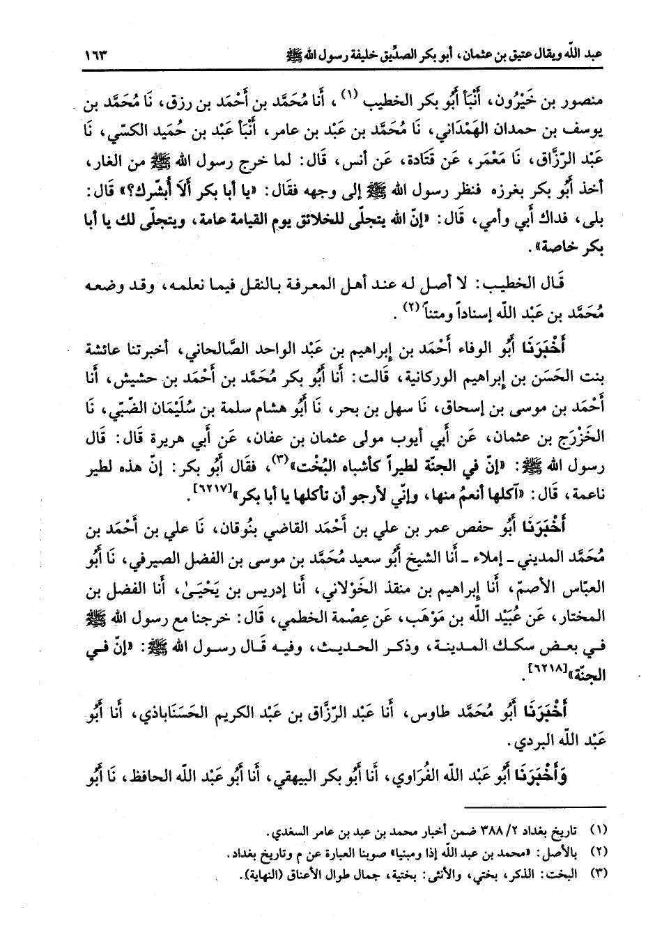 منصور بن خيرون أنبأ أبو بكر الخطيب (1) أنا محمد بن أحمد بن رزق نا محمد بن يوسف بن حمدان الهمداني نا محمد بن عبد بن عامر أنبأ عبد بن حميد الكسي نا عبد الرزاق نا معمر عن قتادة عن أنس قال لما خرج رسول الله (صلى الله عليه وسلم) من الغار أخذ أبو بكر بغرزه فنظر رسول الله (صلى الله عليه وسلم) إلى وجهه فقال يا أبا بكر ألا أبشرك قال بلى فداك أبي وأمي قال إن الله يتجلى للخلائق يوم القيامة عامة ويتجلى لك يا أبا بكر خاصة قال الخطيب لا أصل له عند أهل المعرفة بالنقل فيما نعلمه وقد وضعه محمد بن عبد الله إسنادا ومتنا (2) أخبرنا أبو الوفاء أحمد بن إبراهيم بن عبد الواحد الصالحاني أخبرتنا عائشة بنت الحسن بن إبراهيم الوركانية قالت أنا أبو بكر محمد بن أحمد بن حشيش أنا أحمد بن موسى بن إسحاق نا سهل بن بحر نا أبو هشام سلمة بن سليمان الضبي نا الخزرج بن عثمان عن أبي أيوب مولى عثمان بن عفان عن أبي هريرة قال قال رسول الله (صلى الله عليه وسلم) إن في الجنة لطيرا كأشباه البخت (3) فقال أبو بكر إن هذه لطير ناعمة قال آكلها أنعم منها وإني لأرجو أن تأكلها يا أبا بكر أخبرنا أبو حفص عمر بن علي بن أحمد القاضي بنوقان نا علي بن أحمد بن محمد المديني إملاء أنا الشيخ أبو سعيد محمد بن موسى بن الفضل الصيرفي نا أبو العباس الأصم أنا إبراهيم بن منقذ الخولاني أنا إدريس بن يحيى أنا الفضل بن المختار عن عبيد الله بن موهب عن عصمة الخطمي قال خرجنا مع رسول الله (صلى الله عليه وسلم) في بعض سكك المدينة وذكر الحديث وفيه قال رسول الله (صلى الله عليه وسلم) إن في الجنة أخبرنا أبو محمد طاوس أنا عبد الرزاق بن عبد الكريم الحسناباذي أنا أبو عبد الله البردي وأخبرنا أبو عبد الله الفراوي أنا أبو بكر البيهقي أنا أبو عبد الله الحافظ نا أبو