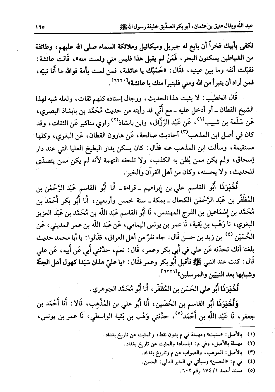 فكفى بأبيك فخرا أن بايع له جبريل وميكائيل وملائكة السماء صلى الله عليهم وطائفة من الشياطين يسكنون البحر فمن لم يقبل هذا فليس مني ولست منه قالت عائشة فقبلت أنفه وما بين عينيه فقال حسبك يا عائشة فمن لست بأمة فوالله ما أنا نبيه فمن أراد أن يتبرأ من الله ومني فليتبرأ منك يا عائشة قال الخطيب لا يثبت هذا الحديث ورجال إسناده كلهم ثقات ولعله شبه لهذا الشيخ القطان أو أدخل عليه مع أني قد رأيته من حديث محمد بن بابشاذ البصري عن سلمة بن شبيب (1) عن عبد الرزاق وابن بابشاذ (2) راوي مناكير عن الثقات وقد كان في اصل ابن المذهب (3) أحاديث صالحة عن هارون القطان عن البغوي وكلها مستقيمة وسألت ابن المذهب عنه فقال كان يسكن بدار البطيخ العليا التي عند دار إسحاق ولم يكن ممن يظن به الكذب ولا تلحقه التهمة لأنه لم يكن ممن يتصدى للحديث ولا يحسنه وكان من أهل القرآن والخير أخبرنا أبو القاسم علي بن إبراهيم قراءة أنا أبو القاسم عبد الرحمن بن المظفر بن عبد الرحمن الكحال بمكة سنة خمس وأربعين أنا أبو بكر أحمد بن محمد بن إسماعيل بن الفرج المهندس نا أبو القاسم عبد الله بن محمد بن عبد العزيز البغوي نا وهب بن بقية نا عمر بن يونس اليمامي عن عبد الله بن عمر المديني عن الحسين (4) بن زيد بن حسن قال جاء نفر من أهل العراق فقالوا يا أبا محمد حديث بلغنا أنك تحدثه عن علي في أبي بكر وعمر قال نعم حدثني أبي عن أبيه عن علي قال كنت عند النبي (صلى الله عليه وسلم) فأقبل أبو بكر وعمر فقال يا علي هذان سيدا كهول أهل الجنة وشبابها بعد النبيين والمرسلين أخبرنا أبو علي الحسن بن المظفر أنا أبو محمد الجوهري وأخبرنا أبو القاسم بن الحصين أنا أبو علي بن المذهب قالا أنا أحمد بن جعفر نا عبد الله بن أحمد (5) حدثني وهب بن بقية الواسطي نا عمر بن يونس