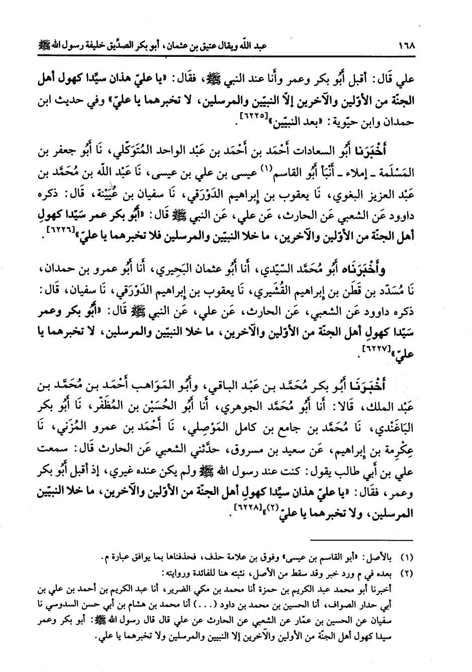 علي قال أقبل أبو بكر وعمر وأنا عند النبي (صلى الله عليه وسلم) فقال يا علي هذان سيدا كهول أهل الجنة من الأولين والآخرين إلا النبيين والمرسلين لا تخبرهما يا علي وفي حديث ابن حمدان وابن حيوية بعد النبيين أخبرنا أبو السعادات أحمد بن أحمد بن عبد الواحد المتوكلي نا أبو جعفر بن المسلمة إملاء أنبأ أبو القاسم (1) عيسى بن علي بن عيسى نا عبد الله بن محمد بن عبد العزيز البغوي نا يعقوب بن إبراهيم الدورقي نا سفيان بن عيينة قال ذكره داوود عن الشعبي عن الحارث عن علي عن النبي (صلى الله عليه وسلم) قال أبو بكر عمر سيدا كهول أهل الجنة من الأولين والآخرين ما خلا النبيين والمرسلين فلا تخبرهما يا علي وأخبرناه أبو محمد السيدي أنا أبو عثمان البحيري أنا أبو عمرو بن حمدان نا مسدد بن قطن بن إبراهيم القشيري نا يعقوب بن إبراهيم الدورقي نا سفيان قال ذكره داوود عن الشعبي عن الحارث عن علي عن النبي (صلى الله عليه وسلم) قال أبو بكر وعمر سيدا كهول أهل الجنة من الأولين والآخرين ما خلا النبيين والمرسلين لا تخبرهما يا علي أخبرنا أبو بكر محمد بن عبد الباقي وأبو المواهب أحمد بن محمد بن عبد الملك قالا أنا أبو محمد الجوهري أنا أبو الحسين بن المظفر نا أبو بكر الباغندي نا محمد بن جامع بن كامل الموصلي نا أحمد بن عمرو المزني نا عكرمة بن إبراهيم عن سعيد بن مسروق حدثني الشعبي عن الحارث قال سمعت