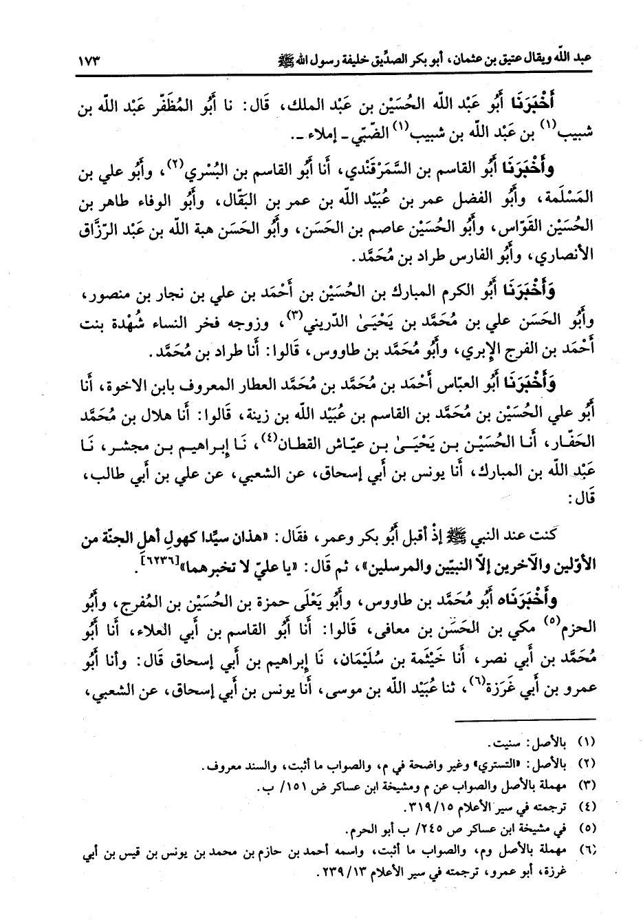 وأخبرنا أبو القاسم بن السمرقندي أنا أبو القاسم بن البسري (2) وأبو علي بن المسلمة وأبو الفضل عمر بن عبيد الله بن عمر بن البقال وأبو الوفاء طاهر بن الحسين القواس وأبو الحسين عاصم بن الحسن وأبو الحسن هبة الله بن عبد الرزاق الأنصاري وأبو الفارس طراد بن محمد وأخبرنا أبو الكرم المبارك بن الحسين بن أحمد بن علي بن نجار بن منصور وأبو الحسن علي بن محمد بن يحيى الدريني (3) وزوجه فخر النساء شهدة بنت أحمد بن الفرج الإبري وأبو محمد بن طاووس قالوا أنا طراد بن محمد وأخبرنا أبو العباس أحمد بن محمد بن محمد العطار المعروف بابن الاخوة أنا أبو علي الحسين بن محمد بن القاسم بن عبيد الله بن زينة قالوا أنا هلال بن محمد الحفار أنا الحسين بن يحيى بن عياش القطان (4) نا إبراهيم بن مجشر نا عبد الله بن المبارك أنا يونس بن أبي إسحاق عن الشعبي عن علي بن أبي طالب قال كنت عند النبي (صلى الله عليه وسلم) إذ أقبل أبو بكر وعمر فقال هذان سيدا كهول أهل الجنة من الأولين والآخرين إلا النبيين والمرسلين ثم قال يا علي لا تخبرهما وأخبرناه أبو محمد بن طاووس وأبو يعلى حمزة بن الحسين بن المفرج وأبو الحزم (5) مكي بن الحسن بن معافى قالوا أنا أبو القاسم بن أبي العلاء أنا أبو محمد بن أبي نصر أنا خيثمة بن سليمان نا إبراهيم بن أبي إسحاق قال وأنا أبو عمرو بن أبي غرزة (6) ثنا عبيد الله بن موسى أنا يونس بن أبي إسحاق عن الشعبي