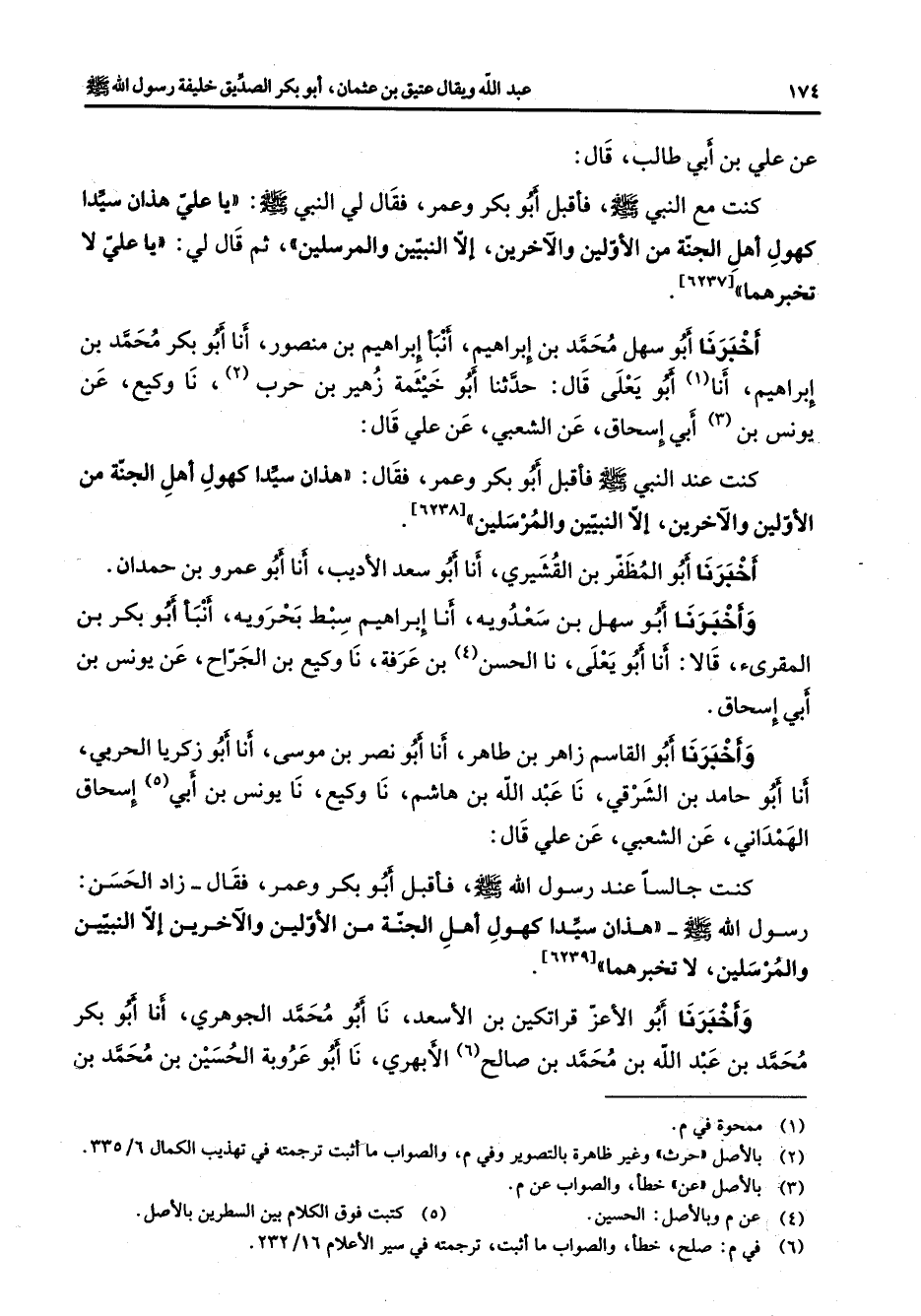 عن علي بن أبي طالب قال كنت مع النبي (صلى الله عليه وسلم) فأقبل أبو بكر وعمر فقال لي النبي (صلى الله عليه وسلم) يا علي هذان سيدا كهول أهل الجنة من الأولين والآخرين إلا النبيين والمرسلين ثم قال لي يا علي لا تخبرهما أخبرنا أبو سهل محمد بن إبراهيم أنبأ إبراهيم بن منصور أنا أبو بكر محمد بن إبراهيم أنا (1) أبو يعلى قال حدثنا أبو خيثمة زهير بن حرب (2) نا وكيع عن يونس بن (3) أبي إسحاق عن الشعبي عن علي قال كنت عند النبي (صلى الله عليه وسلم) فأقبل أبو بكر وعمر فقال هذان سيدا كهول أهل الجنة من الأولين والآخرين إلا النبيين والمرسلين أخبرنا أبو المظفر بن القشيري أنا أبو سعد الأديب أنا أبو عمرو بن حمدان وأخبرنا أبو سهل بن سعدويه أنا إبراهيم سبط بحرويه أنبأ أبو بكر بن المقرئ قالا أنا أبو يعلى نا الحسن (4) بن عرفة نا وكيع بن الجراح عن يونس بن أبي إسحاق وأخبرنا أبو القاسم زاهر بن طاهر أنا أبو نصر بن موسى أنا أبو زكريا الحربي أنا أبو حامد بن الشرقي نا عبد الله بن هاشم نا وكيع نا يونس بن أبي (5) إسحاق الهمداني عن الشعبي عن علي قال كنت جالسا عند رسول الله (صلى الله عليه وسلم) فأقبل أبو بكر وعمر فقال زاد الحسن رسول الله (صلى الله عليه وسلم) هذان سيدا كهول أهل الجنة من الأولين والآخرين إلا النبيين والمرسلين لا تخبرهما وأخبرنا أبو الأعز قراتكين بن الأسعد نا أبو محمد الجوهري أنا أبو بكر محمد بن عبد الله بن محمد بن صالح (6) الأبهري نا أبو عروبة الحسين بن محمد بن