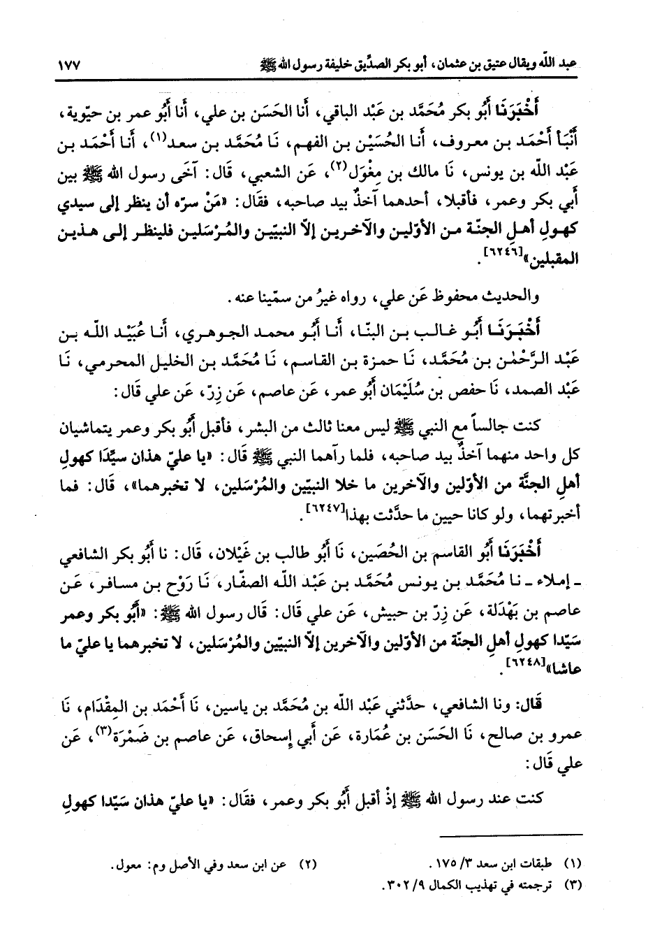 أخبرنا أبو بكر محمد بن عبد الباقي أنا الحسن بن علي أنا أبو عمر بن حيوية أنبأ أحمد بن معروف أنا الحسين بن الفهم نا محمد بن سعد (1) أنا أحمد بن عبد الله بن يونس نا مالك بن مغول (2) عن الشعبي قال آخى رسول الله (صلى الله عليه وسلم) بين أبي بكر وعمر فأقبلا أحدهما آخذ بيد صاحبه فقال من سره أن ينظر إلى سيدي كهول أهل الجنة من الأولين والآخرين إلا النبيين والمرسلين فلينظر إلى هذين المقبلين والحديث محفوظ عن علي رواه غير من سمينا عنه أخبرنا أبو غالب بن البنا أنا أبو محمد الجوهري أنا عبيد الله بن عبد الرحمن بن محمد نا حمزة بن القاسم نا محمد بن الخليل المحرمي نا عبد الصمد نا حفص بن سليمان أبو عمر عن عاصم عن زر عن علي قال كنت جالسا مع النبي (صلى الله عليه وسلم) ليس معنا ثالث من البشر فأقبل أبو بكر وعمر يتماشيان كل واحد منهما آخذ بيد صاحبه فلما رآهما النبي (صلى الله عليه وسلم) قال يا علي هذان سيدا كهول أهل الجنة من الأولين والآخرين ما خلا النبيين والمرسلين لا تخبرهما قال فما أخبرتهما ولو كانا حيين ما حدثت بهذا أخبرنا أبو القاسم بن الحصين نا أبو طالب بن غيلان قال نا أبو بكر الشافعي إملاء نا محمد بن يونس محمد بن عبد الله الصفار نا روح بن مسافر عن عاصم بن بهدلة عن زر بن حبيش عن علي قال قال رسول الله (صلى الله عليه وسلم) أبو بكر وعمر سيدا كهول أهل الجنة من الأولين والآخرين إلا النبيين والمرسلين لا تخبرهما يا علي ما عاشا قال ونا الشافعي حدثني عبد الله بن محمد بن ياسين نا أحمد بن المقدام نا عمرو بن صالح نا الحسن بن عمارة عن أبي إسحاق عن عاصم بن ضمرة (3) عن علي قال كنت عند رسول الله (صلى الله عليه وسلم) إذ أقبل أبو بكر وعمر فقال يا علي هذان سيدا كهول