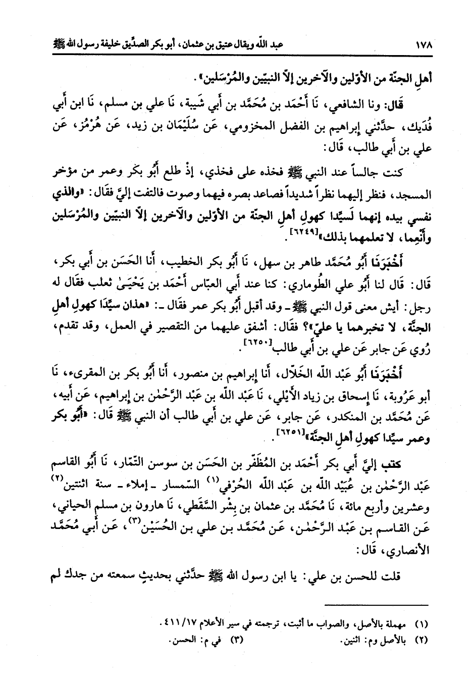 أهل الجنة من الأولين والآخرين إلا النبيين والمرسلين قال ونا الشافعي نا أحمد بن محمد بن أبي شيبة نا علي بن مسلم نا ابن أبي فديك حدثني إبراهيم بن الفضل المخزومي عن سليمان بن زيد عن هرمز عن علي بن أبي طالب قال كنت جالسا عند النبي (صلى الله عليه وسلم) فخذه على فخذي إذ طلع أبو بكر وعمر من مؤخر المسجد فنظر إليهما نظرا شديدا فصاعد بصره فيهما وصوت فالتفت إلي فقال والذي نفسي بيده إنهما لسيدا كهول أهل الجنة من الأولين والآخرين إلا النبيين والمرسلين وأنعما لا تعلمهما بذلك أخبرنا أبو محمد طاهر بن سهل نا أبو بكر الخطيب أنا الحسن بن أبي بكر قال قال لنا أبو علي الطوماري كنا عند أبي العباس أحمد بن يحيى ثعلب فقال له رجل أيش معنى قول النبي (صلى الله عليه وسلم) وقد أقبل أبو بكر عمر فقال هذان سيدا كهول أهل الجنة لا تخبرهما يا علي فقال أشفق عليهما من التقصير في العمل وقد تقدم روي عن جابر عن علي بن أبي طالب أخبرنا أبو عبد الله الخلال أنا إبراهيم بن منصور أنا أبو بكر بن المقرئ نا أبو عروبة نا إسحاق بن زياد الأيلي نا عبد الله بن عبد الرحمن بن إبراهيم عن أبيه عن محمد بن المنكدر عن جابر عن علي بن أبي طالب أن النبي (صلى الله عليه وسلم) قال أبو بكر وعمر سيدا كهول أهل الجنة كتب إلي أبي بكر أحمد بن المظفر بن الحسن بن سوسن التمار نا أبو القاسم عبد الرحمن بن عبيد الله بن عبد الله الحرفي (1) السمسار إملاء سنة اثنتين (2) وعشرين وأربع مائة نا محمد بن عثمان بن بشر السقطي نا هارون بن مسلم الحياني عن القاسم بن عبد الرحمن عن محمد بن علي بن الحسين (3) عن أبي محمد الأنصاري قال قلت للحسن بن علي يا ابن رسول الله (صلى الله عليه وسلم) حدثني بحديث سمعته من جدك لم