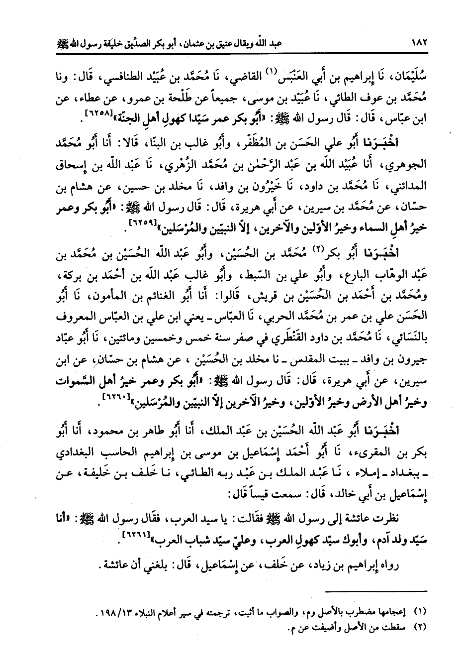 سليمان نا إبراهيم بن أبي العنبس (1) القاضي نا محمد بن عبيد الطنافسي قال ونا محمد بن عوف الطائي نا عبيد بن موسى جميعا عن طلحة بن عمرو عن عطاء عن ابن عباس قال قال رسول الله (صلى الله عليه وسلم) أبو بكر عمر سيدا كهول أهل الجنة أخبرنا أبو علي الحسن بن المظفر وأبو غالب بن البنا قالا أنا أبو محمد الجوهري أنا عبيد الله بن عبد الرحمن بن محمد الزهري نا عبد الله بن إسحاق المدائني نا محمد بن داود نا خيرون بن وافد نا مخلد بن حسين عن هشام بن حسان عن محمد بن سيرين عن أبي هريرة قال قال رسول الله (صلى الله عليه وسلم) أبو بكر وعمر خير أهل السماء وخير الأولين والآخرين إلا النبيين والمرسلين أخبرنا أبو بكر (2) محمد بن الحسين وأبو عبد الله الحسين بن محمد بن عبد الوهاب البارع وأبو علي بن السبط وأبو غالب عبد الله بن أحمد بن بركة ومحمد بن أحمد بن الحسين بن قريش قالوا أنا أبو الغنائم بن المأمون نا أبو الحسن علي بن عمر بن محمد الحربي نا العباس يعني ابن علي بن العباس المعروف بالنسائي نا محمد بن داود القنطري في صفر سنة خمس وخمسين ومائتين نا أبو عباد جيرون بن وافد ببيت المقدس نا مخلد بن الحسين عن هشام بن حسان عن ابن سيرين عن أبي هريرة قال قال رسول الله (صلى الله عليه وسلم) أبو بكر وعمر خير أهل السموات وخير أهل الأرض وخير الأولين وخير الآخرين إلا النبيين والمرسلين أخبرنا أبو عبد الله الحسين بن عبد الملك أنا أبو طاهر بن محمود أنا أبو بكر بن المقرئ نا أبو أحمد إسماعيل بن موسى بن إبراهيم الحاسب البغدادي ببغداد إملاء نا عبد الملك بن عبد ربه الطائي نا خلف بن خليفة عن إسماعيل بن أبي خالد قال سمعت قيسا قال نظرت عائشة إلى رسول الله (صلى الله عليه وسلم) فقالت يا سيد العرب فقال رسول الله (صلى الله عليه وسلم) أنا سيد ولد آدم وأبوك سيد كهول العرب وعلي سيد شباب العرب رواه إبراهيم بن زياد عن خلف عن إسماعيل قال بلغني أن عائشة