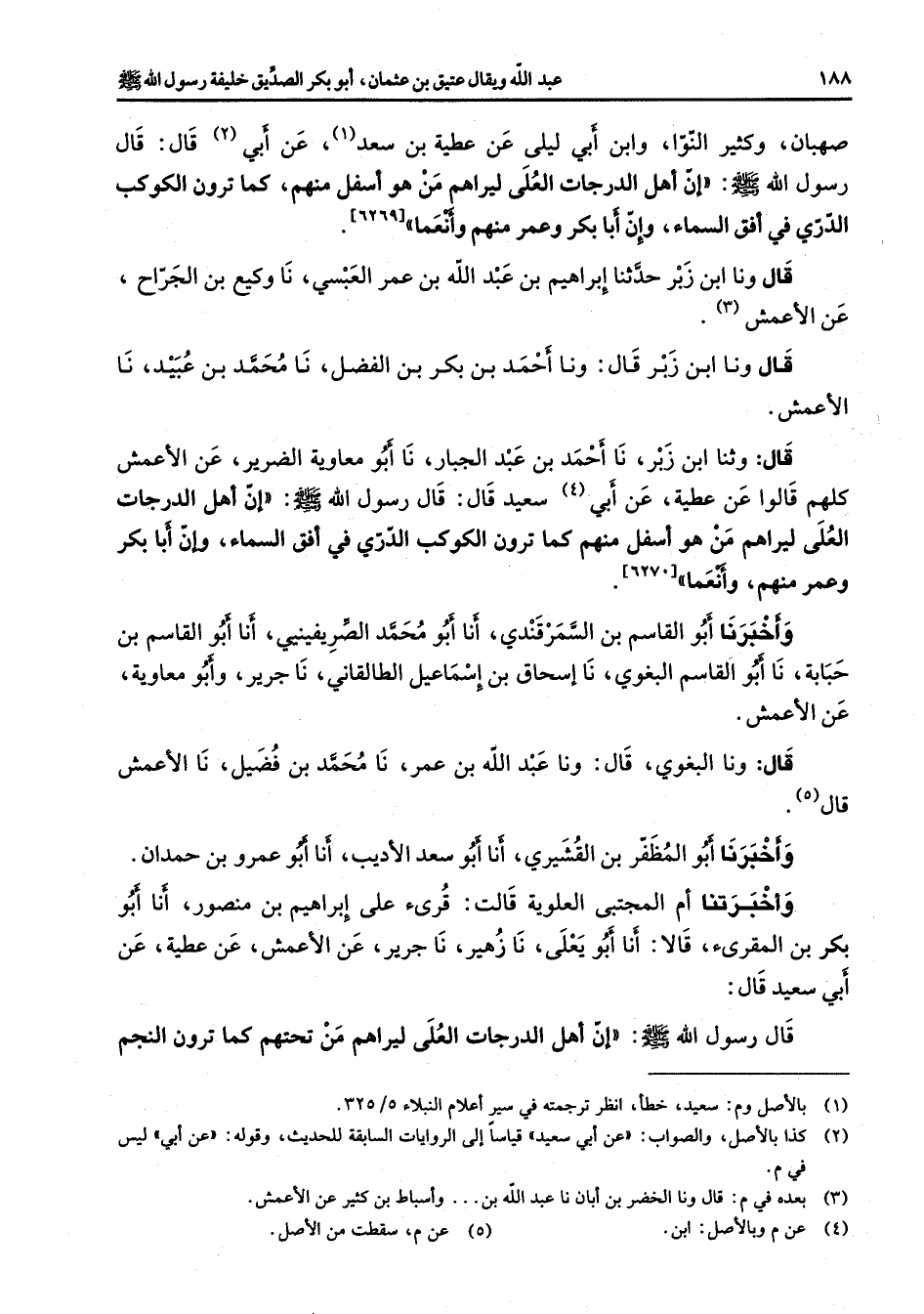 صهبان وكثير النوا وابن أبي ليلى عن عطية بن سعد (1) عن أبي (2) قال قال رسول الله (صلى الله عليه وسلم) إن أهل الدرجات العلى ليراهم من هو أسفل منهم كما ترون الكوكب الدري في أفق السماء وإن أبا بكر وعمر منهم وأنعما قال ونا ابن زبر حدثنا إبراهيم بن عبد الله بن عمر العبسي نا وكيع بن الجراح عن الأعمش (3) قال ونا ابن زبر قال ونا أحمد بن بكر بن الفضل نا محمد بن عبيد نا الأعمش قال وثنا ابن زبر نا أحمد بن عبد الجبار نا أبو معاوية الضرير عن الأعمش كلهم قالوا عن عطية عن أبي (4) سعيد قال قال رسول الله (صلى الله عليه وسلم) إن أهل الدرجات العلى ليراهم من هو أسفل منهم كما ترون الكوكب الدري في أفق السماء وإن أبا بكر وعمر منهم وأنعما وأخبرنا أبو القاسم بن السمرقندي أنا أبو محمد الصريفينيي أنا أبو القاسم بن حبابة نا أبو القاسم البغوي نا إسحاق بن إسماعيل الطالقاني نا جرير وأبو معاوية عن الأعمش قال ونا البغوي قال ونا عبد الله بن عمر نا محمد بن فضيل نا الأعمش قال (5) وأخبرنا أبو المظفر بن القشيري أنا أبو سعد الأديب أنا أبو عمرو بن حمدان وأخبرتنا أم المجتبى العلوية قالت قرئ على إبراهيم بن منصور أنا أبو بكر بن المقرئ قالا أنا أبو يعلى نا زهير نا جرير عن الأعمش عن عطية عن أبي سعيد قال قال رسول الله (صلى الله عليه وسلم) إن أهل الدرجات العلى ليراهم من تحتهم كما ترون النجم