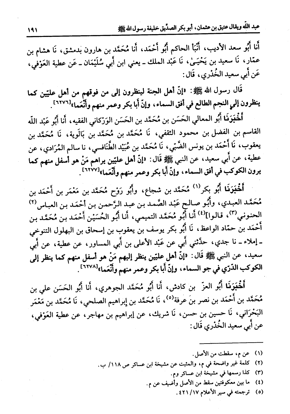 أنا أبو سعد الأديب أنبأ الحاكم أبو أحمد أنا محمد بن هارون بدمشق نا هشام بن عمار نا سعيد بن يحيى نا عبد الملك يعني ابن أبي سليمان عن عطية العوفي عن أبي سعيد الخدري قال قال رسول الله (صلى الله عليه وسلم) إن أهل الجنة لينظرون إلى من فوقهم من أهل عليين كما ينظرون إلى النجم الطالع في أفق السماء وإن أبا بكر وعمر منهم وأنعما أخبرنا أبو المعالي الحسن بن محمد بن الحسن الوركاني الفقيه أنا أبو عبد الله القاسم بن الفضل بن محمود الثقفي نا محمد بن محمد بن بالوية نا محمد بن يعقوب نا أحمد بن يونس الضبي نا محمد بن عبيد الطنافسي نا سالم المرادي عن عطية عن أبي سعيد عن النبي (صلى الله عليه وسلم) قال إن أهل عليين يراهم من هو أسفل منهم كما يرون الكوكب في أفق السماء وإن أبا بكر وعمر منهم وأنعما أخبرنا أبو بكر (1) محمد بن شجاع وأبو روح محمد بن معمر بن أحمد بن محمد العبدي وأبو صالح عبد الصمد بن عبد الرحمن بن أحمد بن العباس (2) الحنوني (3) قالوا (4) أنا أبو محمد التميمي أنا أبو الحسين أحمد بن محمد بن أحمد بن حماد الواعظ نا أبو بكر يوسف بن يعقوب بن إسحاق بن البهلول التنوخي إملاء نا جدي حدثني أبي عن عبد الأعلى بن أبي المساور عن عطية عن أبي سعيد عن النبي (صلى الله عليه وسلم) قال إن أهل عليين ينظر إليهم من هو أسفل منهم كما ينظر إلى الكوكب الدري في جو السماء وإن أبا بكر وعمر منهم وأنعما أخبرنا أبو العز بن كادش أنا أبو محمد الجوهري أنا أبو الحسن علي بن محمد بن أحمد بن نصر بن عرفة (5) نا محمد بن إبراهيم الصلحي نا محمد بن معمر البحراني نا حسين بن حسن نا شريك عن إبراهيم بن مهاجر عن عطية العوفي عن أبي سعيد الخدري قال
