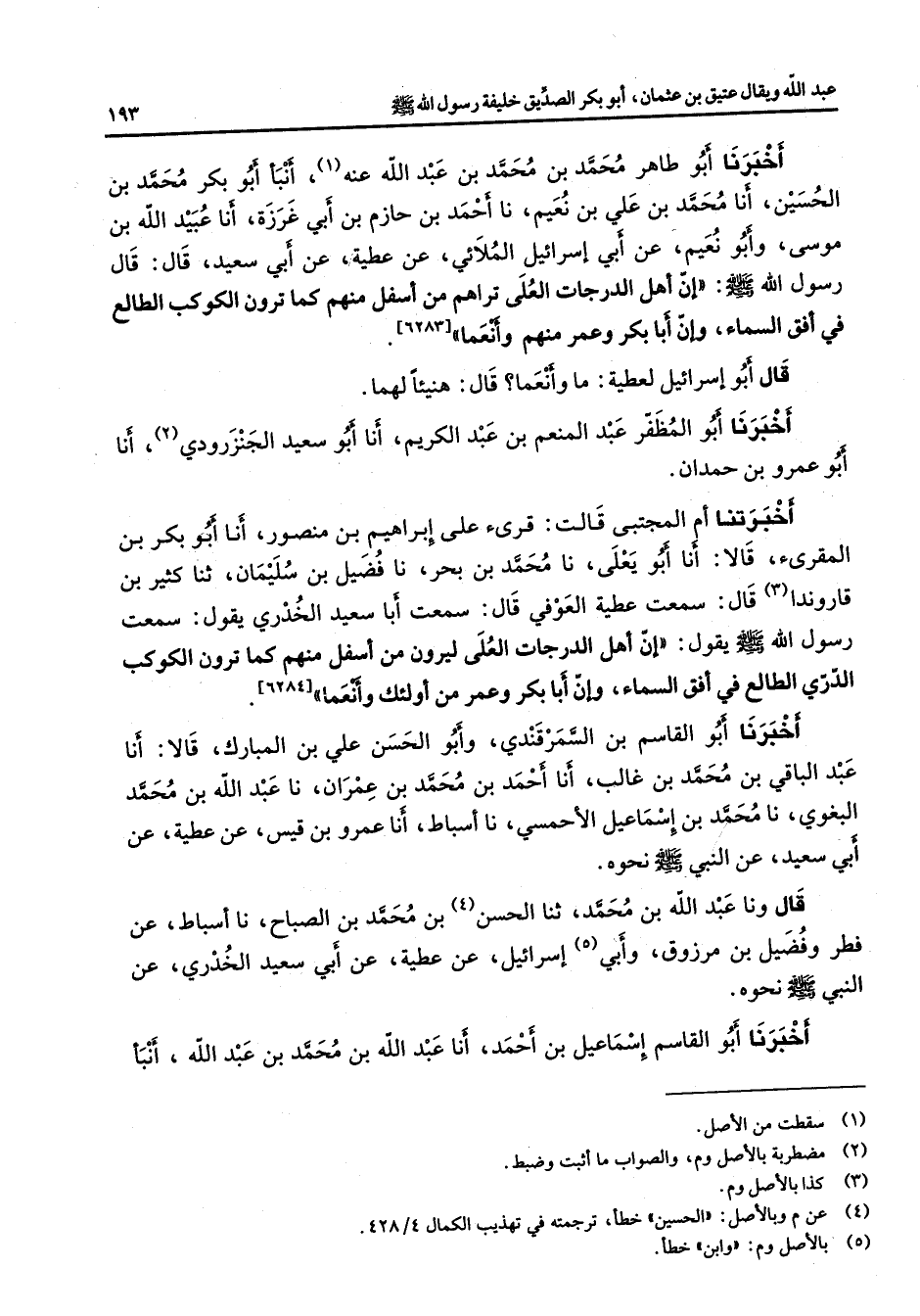 أخبرنا أبو طاهر محمد بن محمد بن عبد الله عنه (1) أنبأ أبو بكر محمد بن الحسين أنا محمد بن علي بن نعيم نا أحمد بن حازم بن أبي غرزة أنا عبيد الله بن موسى وأبو نعيم عن أبي إسرائيل الملائي عن عطية عن أبي سعيد قال قال رسول الله (صلى الله عليه وسلم) إن أهل الدرجات العلى تراهم من أسفل منهم كما ترون الكوكب الطالع في أفق السماء وإن أبا بكر وعمر منهم وأنعما قال أبو إسرائيل لعطية ما وأنعما قال هنيئا لهما أخبرنا أبو المظفر عبد المنعم بن عبد الكريم أنا أبو سعيد الجنزرودي (2) أنا أبو عمرو بن حمدان أخبرتنا أم المجتبى قالت قرئ على إبراهيم بن منصور أنا أبو بكر بن المقرئ قالا أنا أبو يعلى نا محمد بن بحر نا فضيل بن سليمان ثنا كثير بن قاروندا (3) قال سمعت عطية العوفي قال سمعت أبا سعيد الخدري يقول سمعت رسول الله (صلى الله عليه وسلم) يقول إن أهل الدرجات العلى ليرون من أسفل منهم كما ترون الكوكب الدري الطالع في أفق السماء وإن أبا بكر وعمر من أولئك وأنعما أخبرنا أبو القاسم بن السمرقندي وأبو الحسن علي بن المبارك قالا أنا عبد الباقي بن محمد بن غالب أنا أحمد بن محمد بن عمران نا عبد الله بن محمد البغوي نا محمد بن إسماعيل الأحمسي نا أسباط أنا عمرو بن قيس عن عطية عن أبي سعيد عن النبي (صلى الله عليه وسلم) نحوه قال ونا عبد الله بن محمد ثنا الحسن (4) بن محمد بن الصباح نا أسباط عن فطر وفضيل بن مرزوق وأبي (5) إسرائيل عن عطية عن أبي سعيد الخدري عن النبي (صلى الله عليه وسلم) نحوه أخبرنا أبو القاسم إسماعيل بن أحمد أنا عبد الله بن محمد بن عبد الله أنبأ