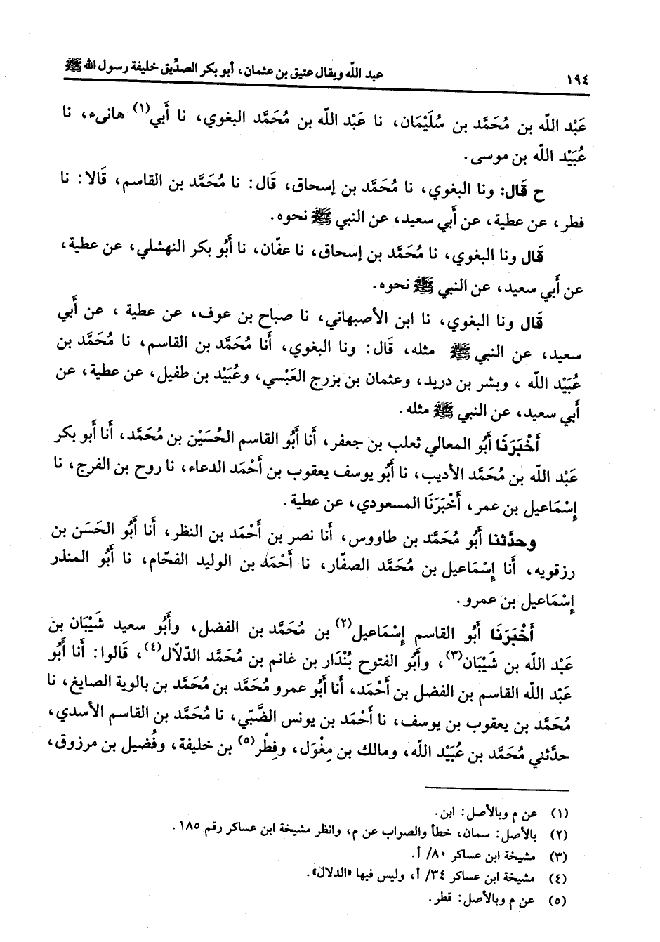 عبد الله بن محمد بن سليمان نا عبد الله بن محمد البغوي نا أبي (1) هانئ نا عبيد الله بن موسى ح قال ونا البغوي نا محمد بن إسحاق قال نا محمد بن القاسم قالا نا فطر عن عطية عن أبي سعيد عن النبي (صلى الله عليه وسلم) نحوه قال ونا البغوي نا محمد بن إسحاق نا عفان نا أبو بكر النهشلي عن عطية عن أبي سعيد عن النبي (صلى الله عليه وسلم) نحوه قال ونا البغوي نا ابن الأصبهاني نا صباح بن عوف عن عطية عن أبي سعيد عن النبي (صلى الله عليه وسلم) مثله قال ونا البغوي أنا محمد بن القاسم نا محمد بن عبيد الله وبشر بن دريد وعثمان بن بزرج العبسي وعبيد بن طفيل عن عطية عن أبي سعيد عن النبي (صلى الله عليه وسلم) مثله أخبرنا أبو المعالي ثعلب بن جعفر أنا أبو القاسم الحسين بن محمد أنا أبو بكر عبد الله بن محمد الأديب نا أبو يوسف يعقوب بن أحمد الدعاء نا روح بن الفرج نا إسماعيل بن عمر أخبرنا المسعودي عن عطية وحدثنا أبو محمد بن طاووس أنا نصر بن أحمد بن النظر انا أبو الحسن بن رزقويه أنا إسماعيل بن محمد الصفار نا أحمد بن الوليد الفحام نا أبو المنذر إسماعيل بن عمرو أخبرنا أبو القاسم إسماعيل (2) بن محمد بن الفضل وأبو سعيد شيبان بن عبد الله بن شيبان (3) وأبو الفتوح بندار بن غانم بن محمد الدلال (4) قالوا أنا أبو عبد الله القاسم بن الفضل بن أحمد أنا أبو عمرو محمد بن محمد بن بالوية الصايغ نا محمد بن يعقوب بن يوسف نا أحمد بن يونس الضبي نا محمد بن القاسم الأسدي حدثني محمد بن عبيد الله ومالك بن مغول وفطر (5) بن خليفة وفضيل بن مرزوق