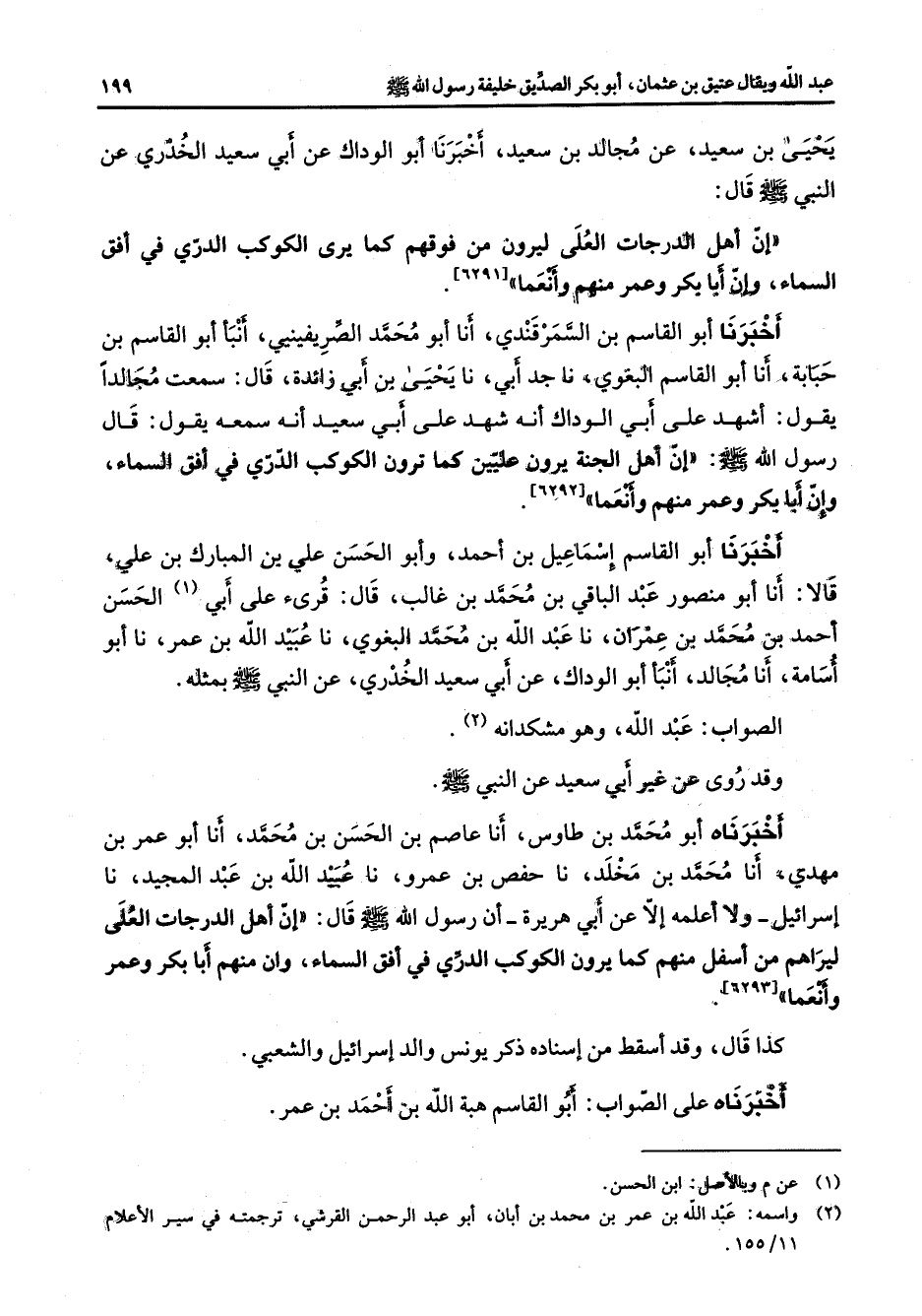 يحيى بن سعيد عن مجالد بن سعيد أخبرنا أبو الوداك عن أبي سعيد الخدري عن النبي (صلى الله عليه وسلم) قال إن أهل الدرجات العلى ليرون من فوقهم كما يرى الكوكب الدري في أفق السماء وإن أبا بكر وعمر منهم وأنعما أخبرنا أبو القاسم بن السمرقندي أنا أبو محمد الصريفينيي أنبأ أبو القاسم بن حبابة أنا أبو القاسم البغوي نا جد أبي نا يحيى بن أبي زائدة قال سمعت مجالدا يقول أشهد على أبي الوداك أنه شهد على أبي سعيد أنه سمعه يقول قال رسول الله (صلى الله عليه وسلم) إن أهل الجنة يرون عليين كما ترون الكوكب الدري في أفق السماء وإن أبا بكر وعمر منهم وأنعما أخبرنا أبو القاسم إسماعيل بن أحمد وأبو الحسن علي بن المبارك بن علي قالا أنا أبو منصور عبد الباقي بن محمد بن غالب قال قرئ على أبي (1) الحسن أحمد بن محمد بن عمران نا عبد الله بن محمد البغوي نا عبيد الله بن عمر نا أبو أسامة أنا مجالد أنبأ أبو الوداك عن أبي سعيد الخدري عن النبي (صلى الله عليه وسلم) بمثله الصواب عبد الله وهو مشكدانه (2) وقد روي عن غير ابن سعيد عن النبي (صلى الله عليه وسلم) أخبرناه أبو محمد بن طاوس أنا عاصم بن الحسن بن محمد أنا أبو عمر بن مهدي أنا محمد بن مخلد نا حفص بن عمرو نا عبيد الله بن عبد المجيد نا إسرائيل ولا أعلمه إلا عن أبي هريرة أن رسول الله (صلى الله عليه وسلم) قال إن أهل الدرجات العلى ليراهم من أسفل منهم كما يرون الكوكب الدري في أفق السماء وان منهم أبا بكر وعمر وأنعما كذا قال وقد أسقط من إسناده ذكر يونس والد إسرائيل والشعبي أخبرناه على الصواب أبو القاسم هبة الله بن أحمد بن عمر