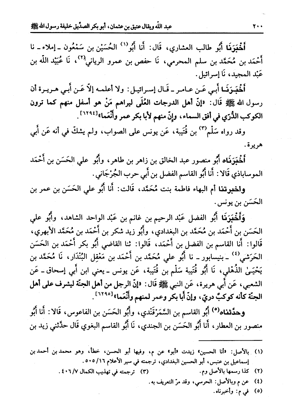 اخبرنا أبو طالب العشاري قال أنا أبو (1) الحسين بن سمعون إملاء نا أحمد بن محمد بن سلم المحرمي نا حفص بن عمرو الرياني (2) نا عبيد الله بن عبد المجيد نا إسرائيل أخبرنا أبي عن عامر قال إسرائيل ولا أعلمه إلا عن أبي هريرة أن رسول الله (صلى الله عليه وسلم) قال إن أهل الدرجات العلى ليراهم من هو أسفل منهم كما ترون الكوكب الدري في أفق السماء وإن منهم لأبا بكر وعمر وأنعما وقد رواه سلم (3) بن قتيبة عن يونس على الصواب ولم يشك في أنه عن أبي هريرة أخبرناه أبو منصور عبد الخالق بن زاهر بن طاهر وأبو علي الحسن بن أحمد الموساباذي قالا أنا أبو القاسم الفضل بن أبي حرب الجرجاني وأخبرتنا أم البهاء فاطمة بنت محمد قالت أنا أبو علي الحسن بن عمر بن الحسن بن يونس وأخبرنا أبو الفضل عبد الرحيم بن غانم بن عبد الواحد الشاهد وابو علي الحسن بن أحمد بن محمد بن البغدادي وأبو زيد شكر بن أحمد بن محمد الأبهري قالوا أنا القاسم بن الفضل بن أحمد قالوا ثنا القاضي أبو بكر أحمد بن الحسن الحرشي (4) بنيسابور نا أبو علي محمد بن أحمد بن معقل البندار نا محمد بن يحيى الذهلي نا أبو قتيبة سلم بن قتيبة عن يونس يعني ابن أبي إسحاق عن الشعبي عن أبي هريرة عن النبي (صلى الله عليه وسلم) قال إن الرجل من أهل الجنة ليشرف على أهل الجنة كأنه كوكب دري وإن أبا بكر وعمر لمنهم وأنعما وحدثناه (5) أبو القاسم بن السمرقندي وأبو الحسن بن الفاعوس قالا أنا أبو منصور بن العطار أنا أبو الحسن بن الجندي نا أبو القاسم البغوي قال حدثني زيد بن